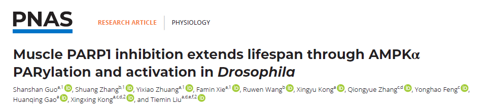 2023年3月23日,2026年足球世界杯直播刘铁民教授团队和孔星星教授团队在PNAS杂志上合作发表了一篇题为Muscle PARP1 inhibition extends lifespan through AMPKα PARylation and activation in Drosophila的论文,该研究指出在年老果蝇中抑制PARP1,可延长寿命,并发现在骨骼肌中敲低PARP1可通过下调AMPK的多糖ADP-核糖基化修饰、增加AMPKα的活性,后者通过上调PGC-1α和PINK1的表达导致线粒体周转加速,肌肉代谢增加、功能增强,阐释PARP1/AMPK参与精准调控衰老进程的分子机制。