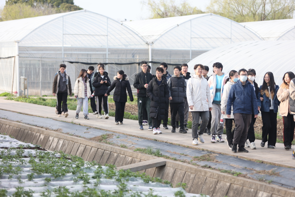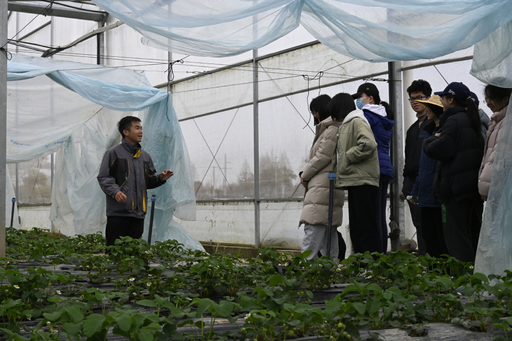 农业是农村发展的根基。在农业发展方面,吴房村在原有黄桃种植优势的基础上,进一步开发可能性,通过与工厂合作,生产黄桃汽水、黄桃啤酒等衍生品,延长了产业链,并给当地农民带去了更多收益。此外,吴房村还引进了草莓等农产品,借鉴国内外先进种植技术,实现农业多元化发展。当地农业技术人员,被同学们称为“草莓王子”的刘彦斌,为同学们讲解了不同草莓品种的特点和种植技巧。“有的草莓是无土栽培,但在甜度上会有影响。”“我们考察过奶油草莓,巧克力草莓,‘白雪公主’草莓等很多品种,最终选择了在这里种植这几类”……同学们在动手操作,去除草莓老叶的同时,也好奇追问着关于草莓的种种问题。为什么超市卖的草莓个头可以那么大?奉贤种植的草莓和青浦的草莓品种相同吗?刘彦斌结合自己多年的工作经验和专业知识,为同学们一一作答。“一边感叹于科技的神奇,一边感叹于种植者培育时的精心与创新。”来自2021级经济学国际项目班的缪可言同学感言。