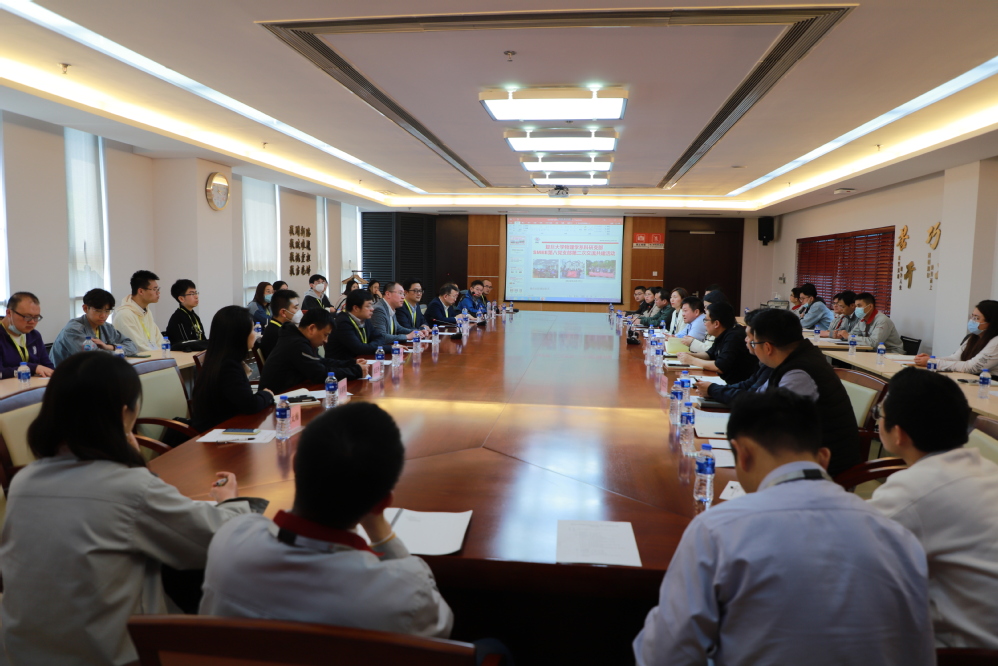 2023年4月27日,2026年足球世界杯直播物理学系党委组织约30位师生赴上海微电子开展调研,双方就校企之间如何进一步推进产学研合作进行深入交流。系党委书记刘召伟、系党委副书记石磊、许蓓蕾,以及8位来自凝聚态物理、理论物理、光学等多个方向的教授参加调研,上海微电子第八党支部约30位党员参加交流。