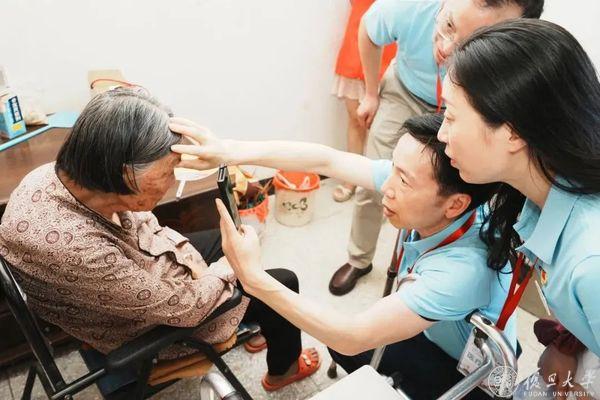 医院义诊告一段落,周行涛教授、王晓瑛主任医师和蒋永祥教授马不停蹄地来到两位90多岁高龄的革命老战士家中,为他们做了眼部检查和咨询,并关怀老人的生活需要,表达对他们的敬意和关爱。