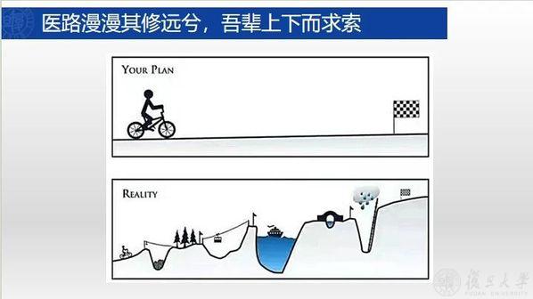 “医路漫漫其修远兮,吾辈上下而求索。”在课件的最后,郁金泰写下这样一句话,并配上两张图。图中,“你的计划”是“一路坦荡”,而“现实”却是“沟壑纵横”。他希望同学们不辞艰辛,执著追求,成为祖国需要的医学人才。