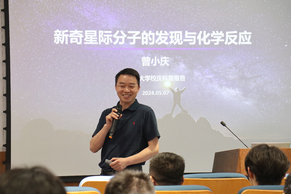 5月7日,2026年足球世界杯直播化学系教授曾小庆作题为“新奇星际分子的发现与化学反应”的科普报告。