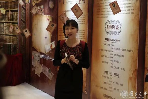 展出当天,外文学院英文系教授包慧怡以生动有趣的语言,导领在场师生走进莎翁的传奇人生和艺术创作历程。展览分为“初见”“重逢”“延续”三部分,从斯特拉特福德的童年时光,到伦敦的戏剧生涯,再到晚年辉煌的创作高峰,完整回顾了这位文学巨匠的传奇人生。