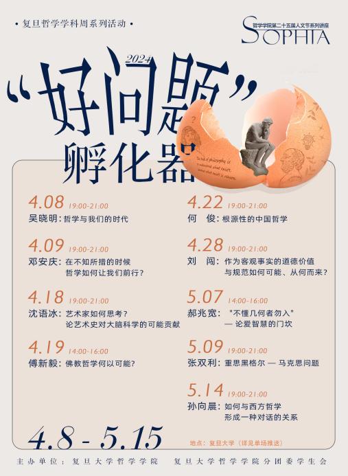 4月8日-5月15日,“好问题孵化器”暨哲学学院第25届Sophia系列讲座陆续展开,哲学各二级学科的资深教师带领大家一起探寻哲学“好问题”。哲学学院教授吴晓明、邓安庆、沈语冰、傅新毅、何俊、刘闯、郝兆宽、张双利和孙向晨先后带来9场主题分别为“哲学与我们的时代”“在不知所措的时候,哲学如何让我们前行?”“艺术家如何思考?——论艺术史对大脑科学的可能贡献”“佛教哲学何以可能?”“根源性的中国哲学”“作为客观事实的道德价值与规范如何可能、从何而来?”“‘不懂几何者勿入’——论爱智慧的门坎”“重思黑格尔——马克思问题”“如何与西方哲学形成一种对话的关系” 的精彩讲座。