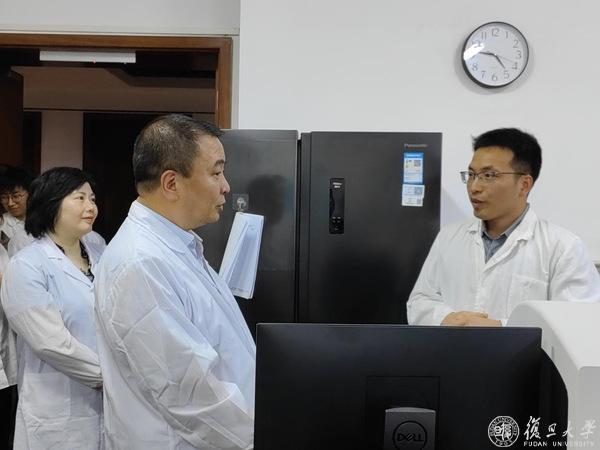 在环境系3019实验室,身穿实验服的同学们正忙着各自的科研任务。金力询问实验室开放情况、安全工作情措施和近期科研开展情况,负责人作相关汇报。