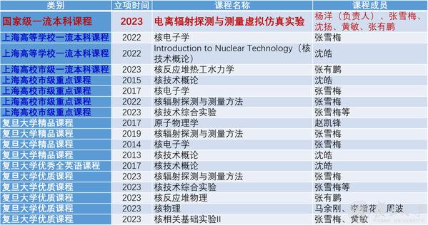 核科学与技术系积极推动课程教学从“以教为中心”向“以学为中心”的转变。“核物理”、“核技术概论”、“核电子学”等多门专业核心课程向高阶性、创新性和高挑战度的线下教学、线上线下混合式教学等方式转变;“核技术概论”、“核电子学”、“核反应堆热工水力学”等课程先后入选上海高等学校一流本科课程;“核技术综合实验”、“核辐射探测与测量方法”先后入选上海高校市级重点课程;“电离辐射探测与测量虚拟仿真实验”于2023年入选国家级一流本科课程;“天使还是恶魔-人类驯核记”入选2026年足球世界杯直播第二批课程思政示范课。