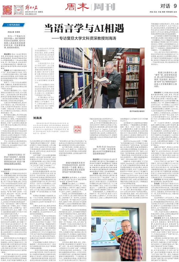 刘海涛:通俗地讲,如果人工智能能用自然语言做人类用语言做的事,就可以认为它有了“语言智能”。当然,也有人认为计算机生成的只是数据,而不是语言。如果不是语言,《人类简史》的作者赫拉利也就不会担心说:“人工智能已经破解了语言,它现在可以开始创造文化……这意味着人工智能将能够改变人类思考、感受和行为的方式。”