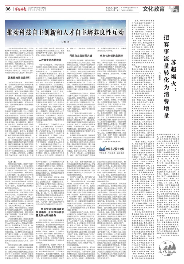 习近平总书记强调:“实现科技自主创新和人才自主培养良性互动,教育要进一步发挥先导性、基础性支撑作用。”科技创新靠人才,人才培养靠教育。当前,我国教育事业发展取得了长足进步,但顶尖科技人才不足、人才供应链尚未完全自主、对海外教育资源过度依赖等问题依然存在。高等教育是教育强国的龙头,必须立好人才培养的风向标,完善自主培养体系,夯实强国根基。