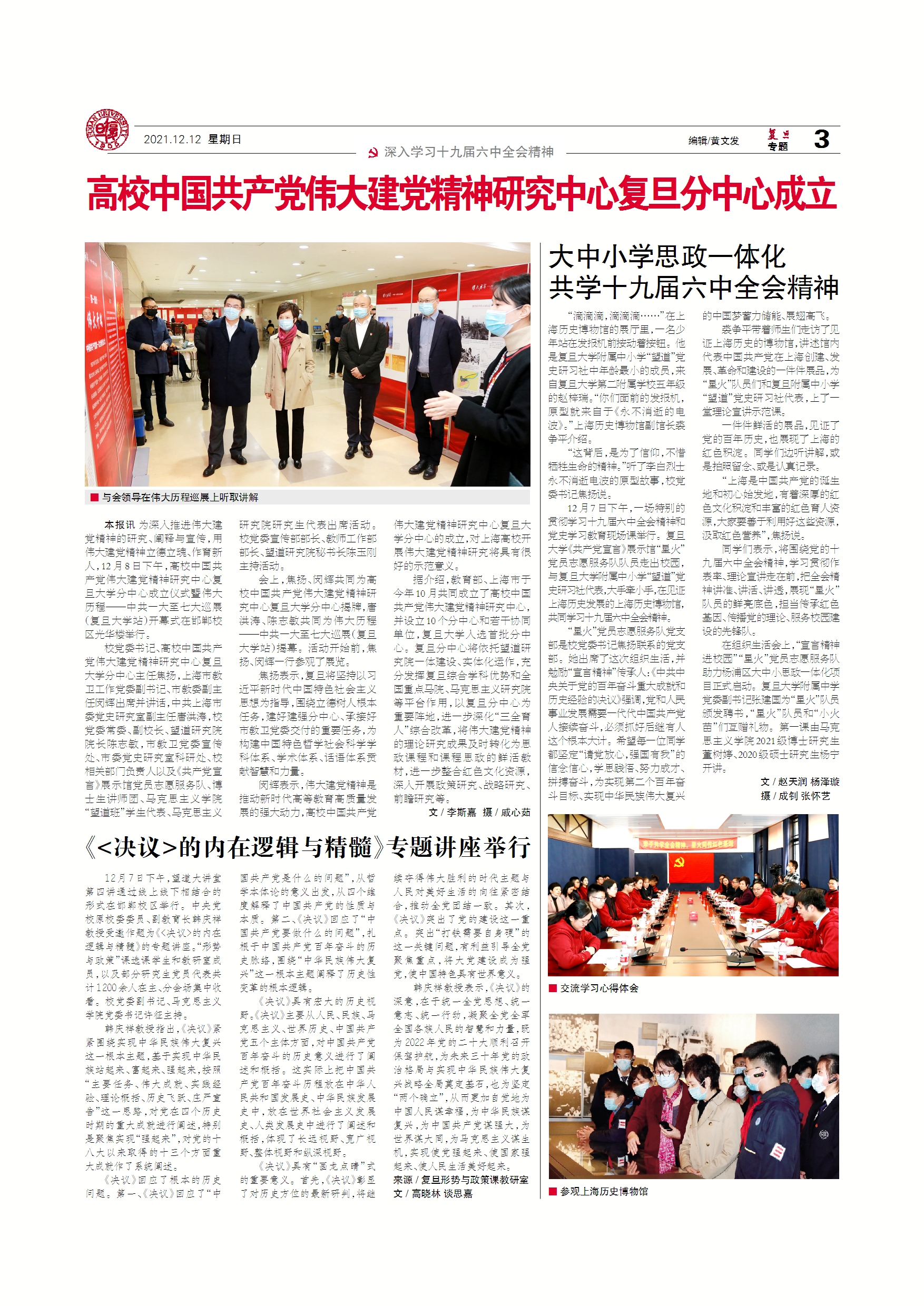 12月7日下午,望道大讲堂第四讲通过线上线下相结合的形式在邯郸校区举行。中央党校原校委委员、副教育长韩庆祥教授受邀作题为《决议的内在逻辑与精髓》的专题讲...