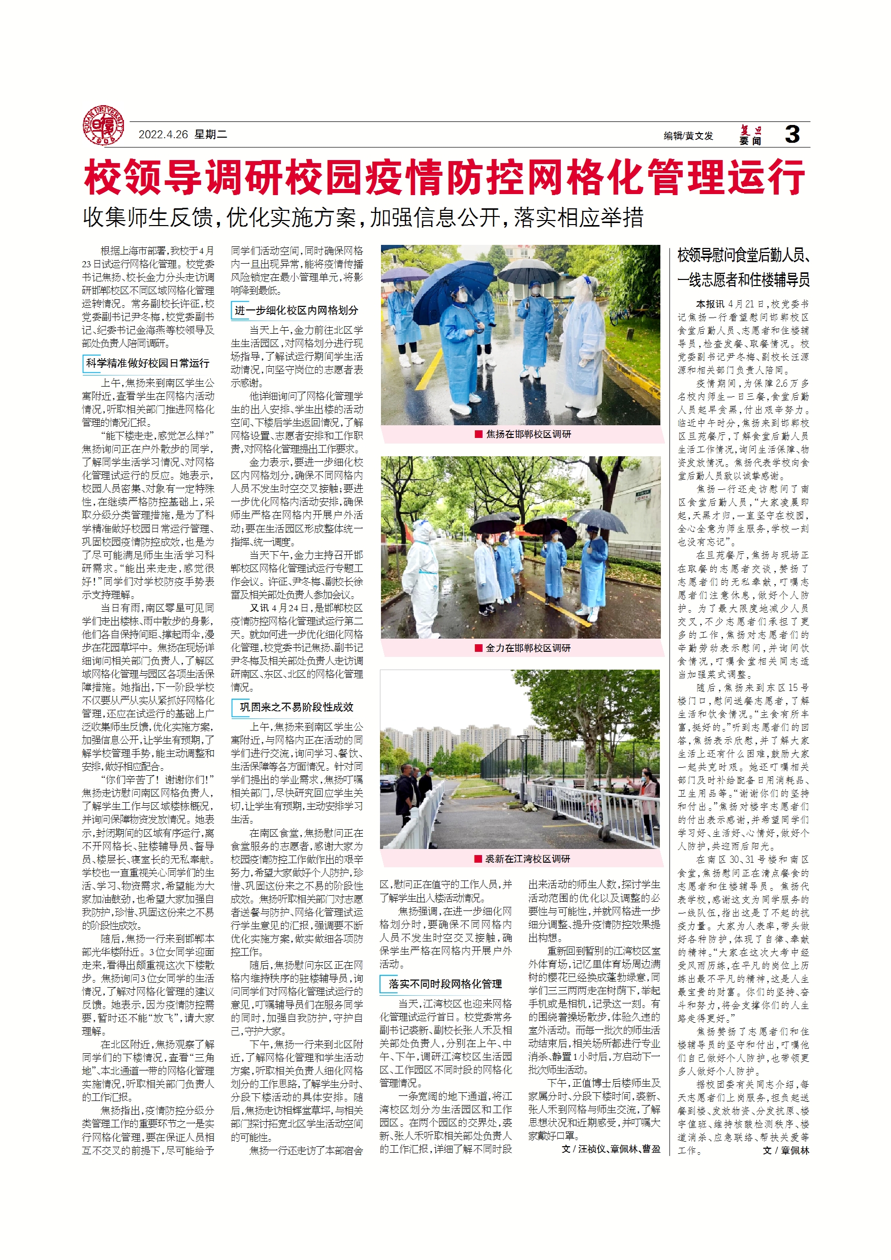 根据上海市部署,我校于4月23日试运行网格化管理。校党委书记焦扬、校长金力分头走访调研邯郸校区不同区域网格化管理运转情况。常务副校长许征,校党委副书记尹...