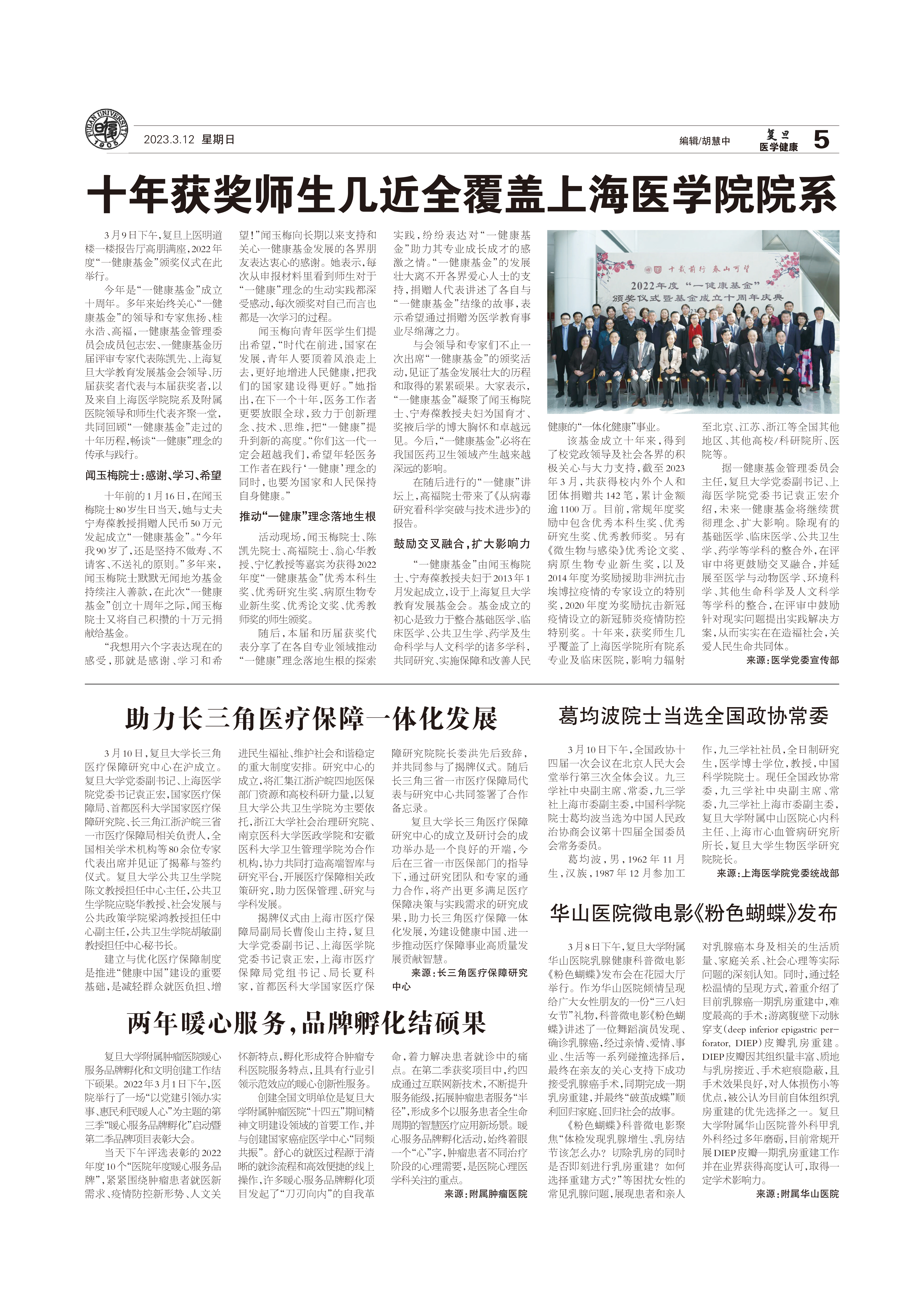 3月9日下午,复旦上医明道楼一楼报告厅高朋满座,2022年度“一健康基金”颁奖仪式在此举行。今年是“一健康基金”成立十周年。多年来始终关心“一健康基金”的领...