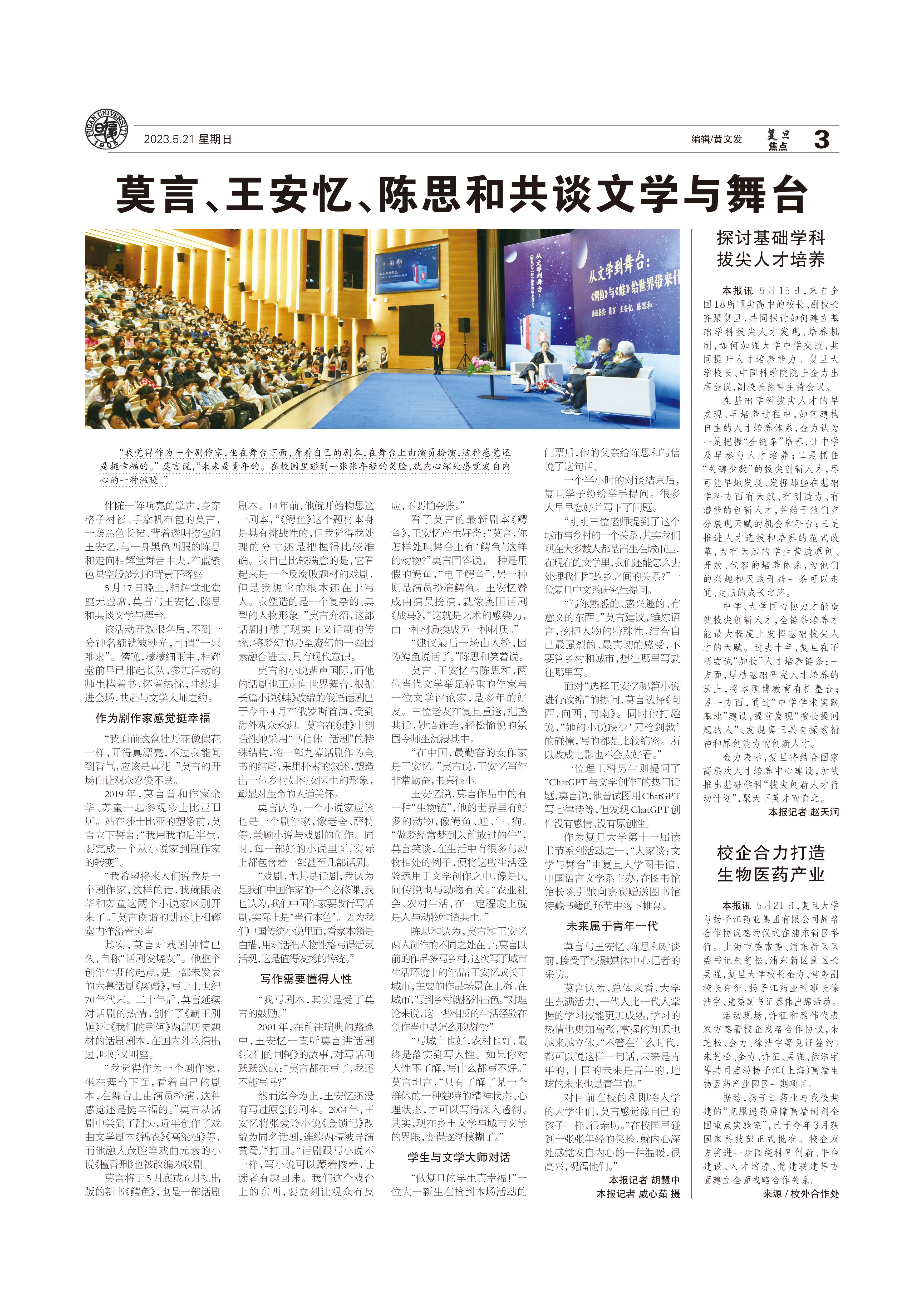 “我觉得作为一个剧作家,坐在舞台下面,看着自己的剧本,在舞台上由演员扮演,这种感觉还是挺幸福的。” 莫言说,“未来是青年的。在校园里碰到一张张年轻的笑...
