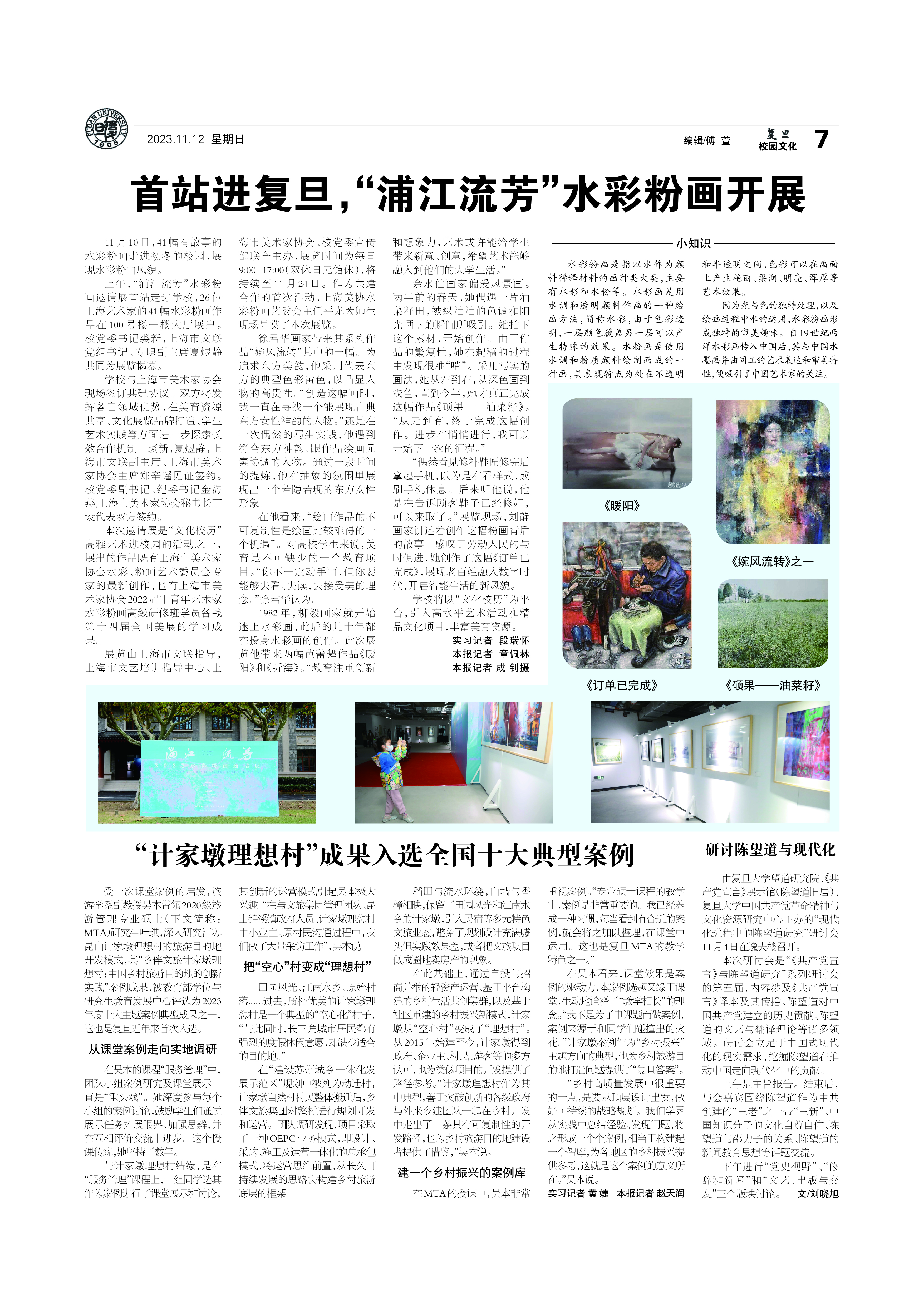 11月10日,41幅有故事的水彩粉画走进初冬的校园,展现水彩粉画风貌。上午,“浦江流芳”水彩粉画邀请展首站走进学校,26位上海艺术家的41幅水彩粉画作品在100号...