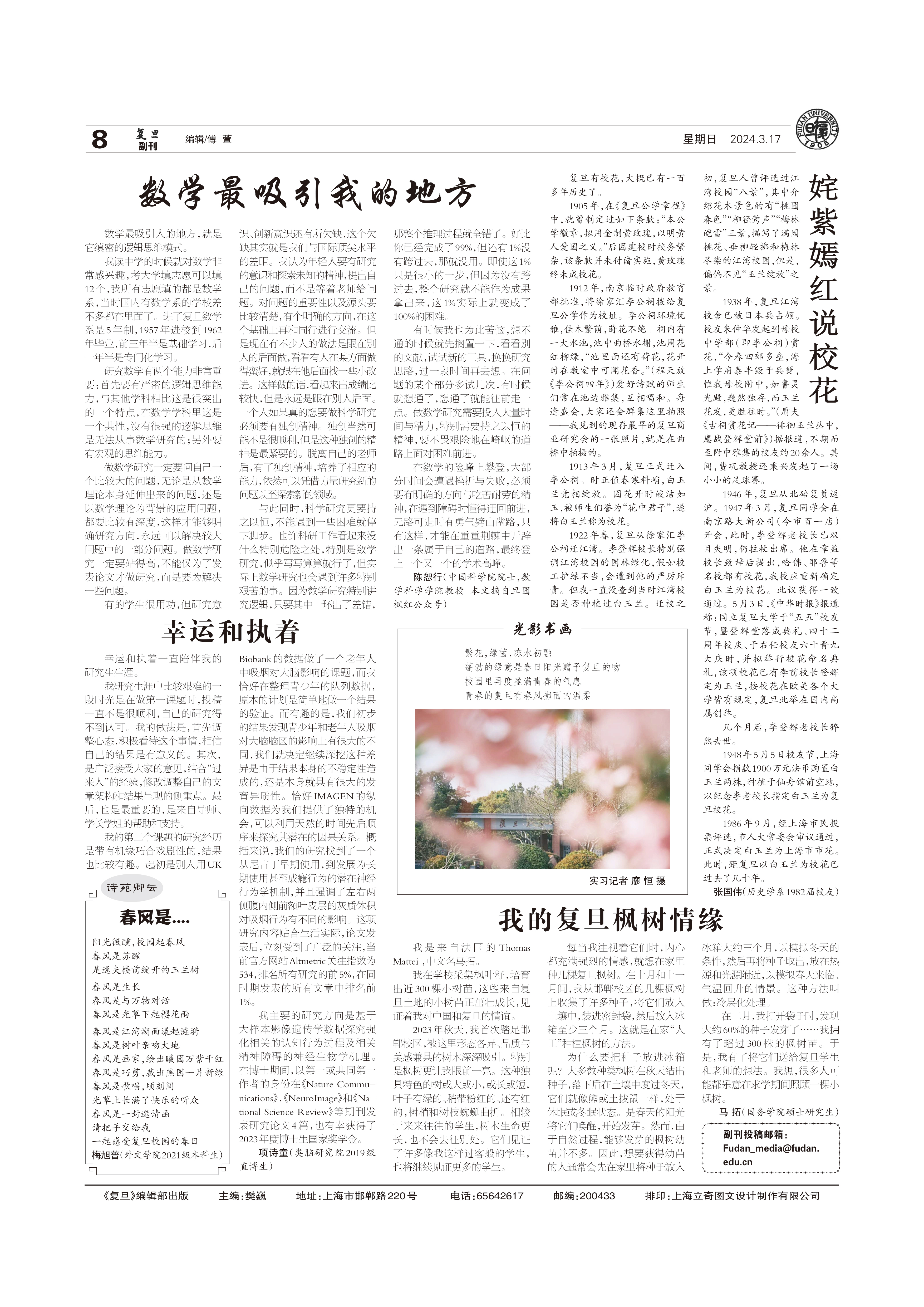 阳光微醺,校园起春风春风是苏醒是逸夫楼前绽开的玉兰树春风是生长春风是与万物对话春风是光草下起樱花雨春风是江湾湖面漾起涟漪春风是树叶亲吻大地春风是画家,...
