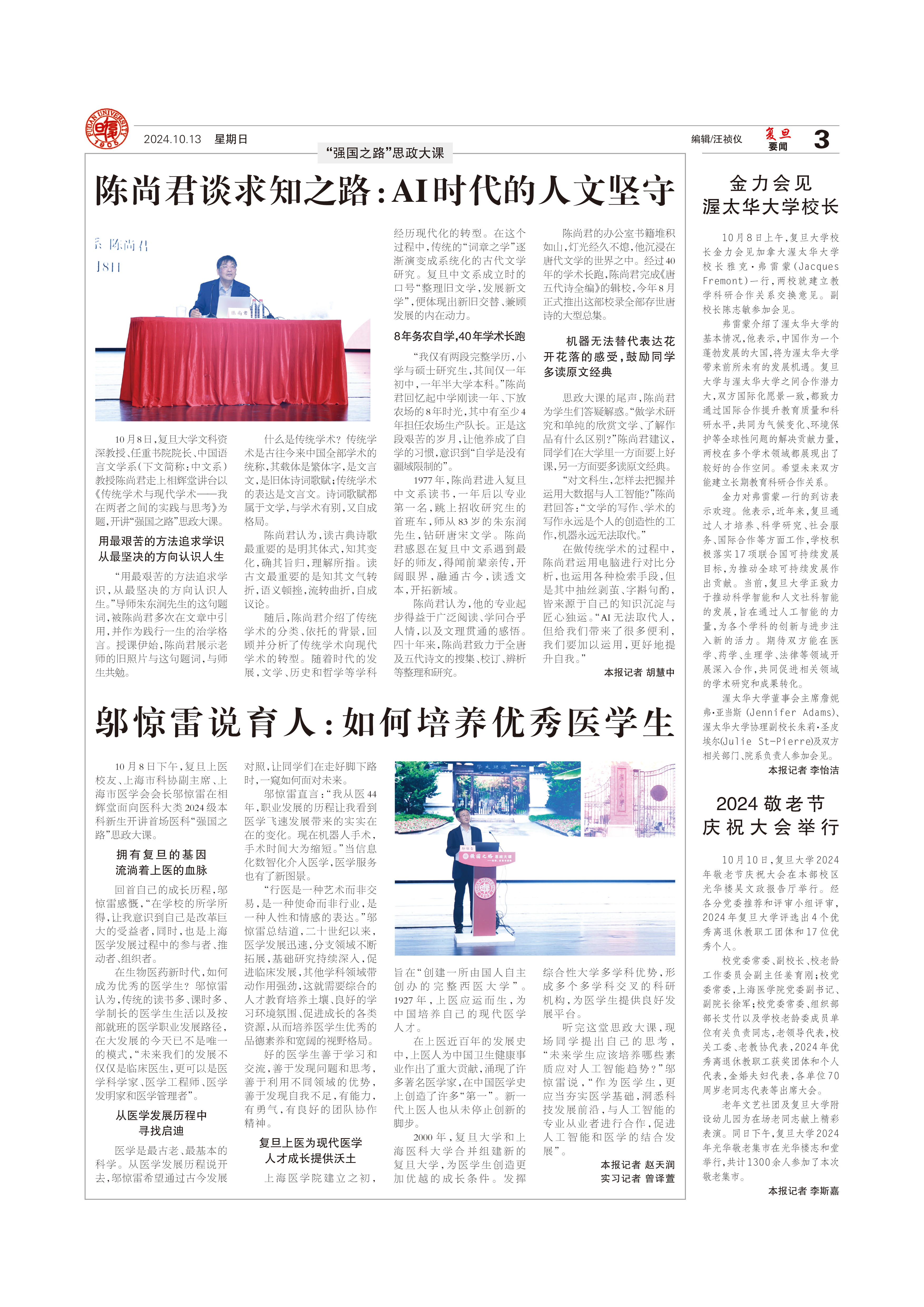 10月8日下午,复旦上医校友、上海市科协副主席、上海市医学会会长邬惊雷在相辉堂面向医科大类2024级本科新生开讲首场医科“强国之路”思政大课。拥有复旦的基因...