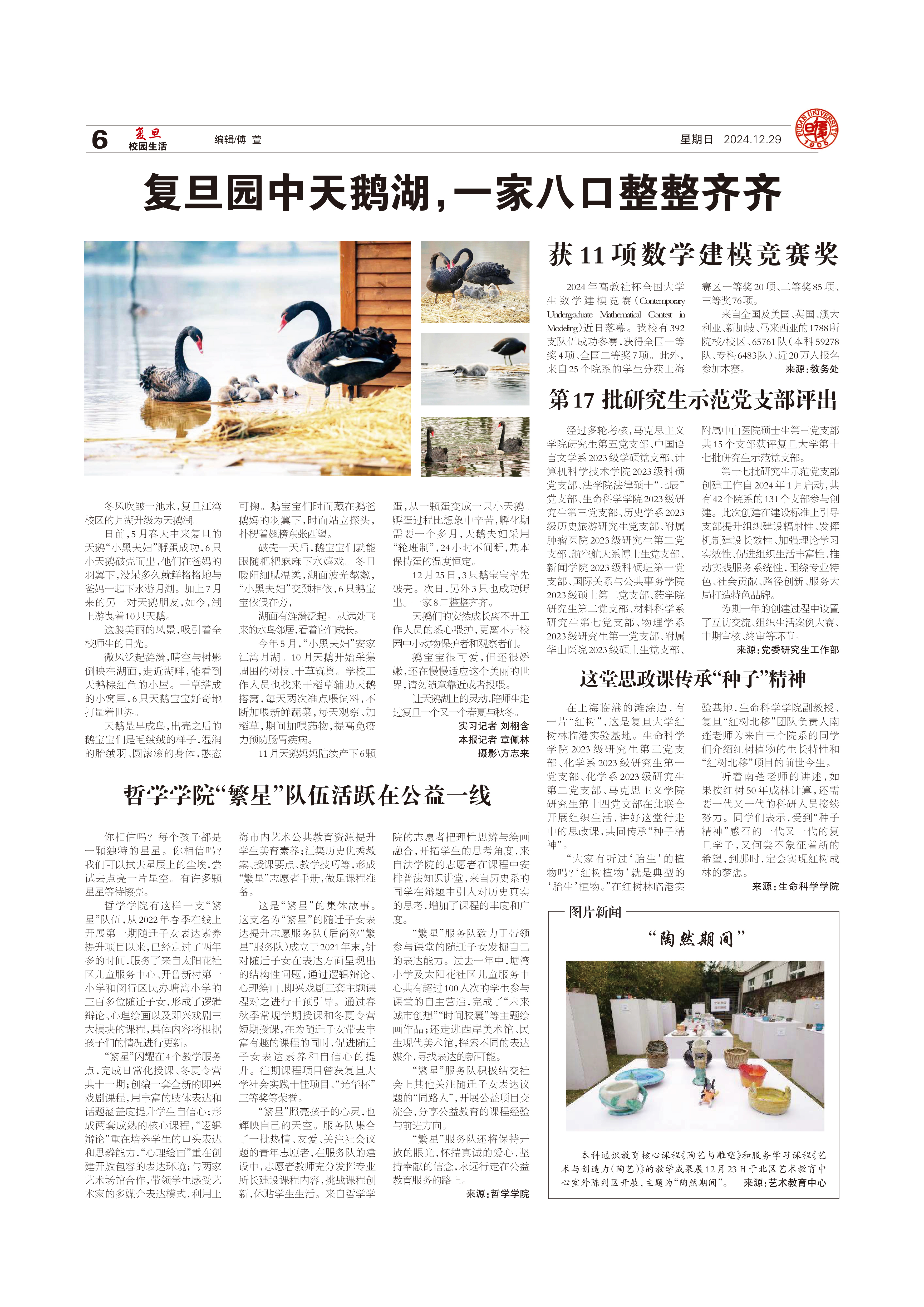 冬风吹皱一池水,复旦江湾校区的月湖升级为天鹅湖。日前,5月春天中来复旦的天鹅“小黑夫妇”孵蛋成功,6只小天鹅破壳而出,他们在爸妈的羽翼下,没呆多久就鲜格...