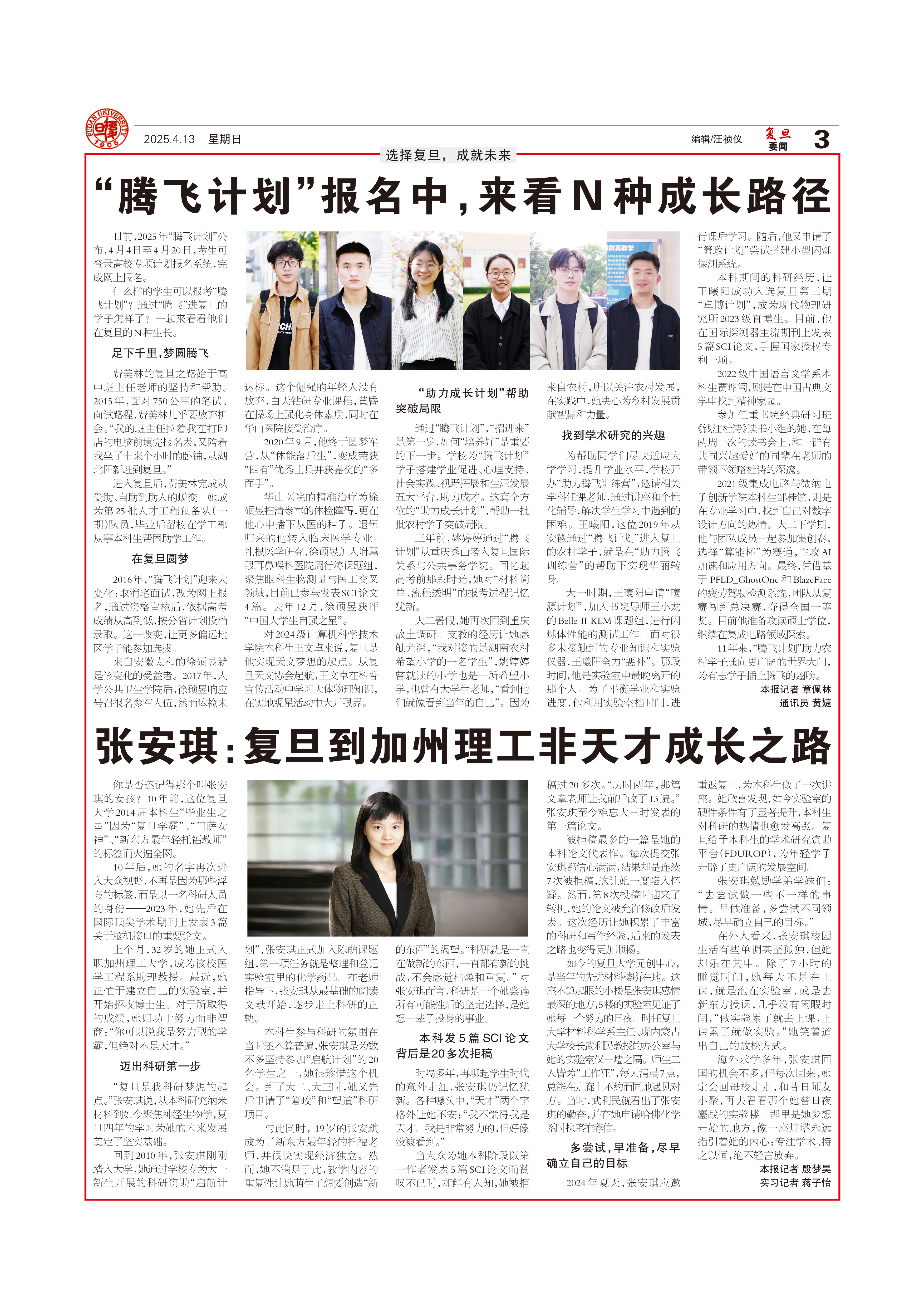 日前,2025年“腾飞计划”公布,4月4日至4月20日,考生可登录高校专项计划报名系统,完成网上报名。什么样的学生可以报考“腾飞计划”?通过“腾飞”进复旦的学...