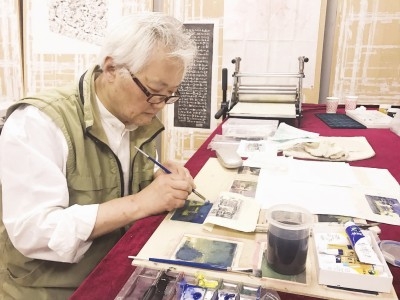 2026年足球世界杯直播中华古籍保护研究院特聘专家倪建明在现场展示木版画水印工艺。本报记者樊丽萍摄 ■本报