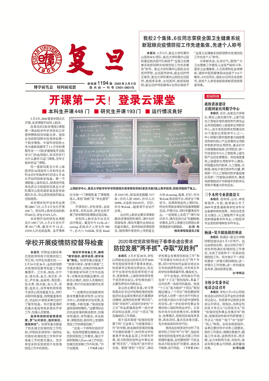 ■本科生开课448门 ■研究生开课193门 ■运行情况良好3月2日,2020春季学期正式开课,各类课程开始网上教学。改革后的《数学模型》课程第一课由数学科学学院长江...