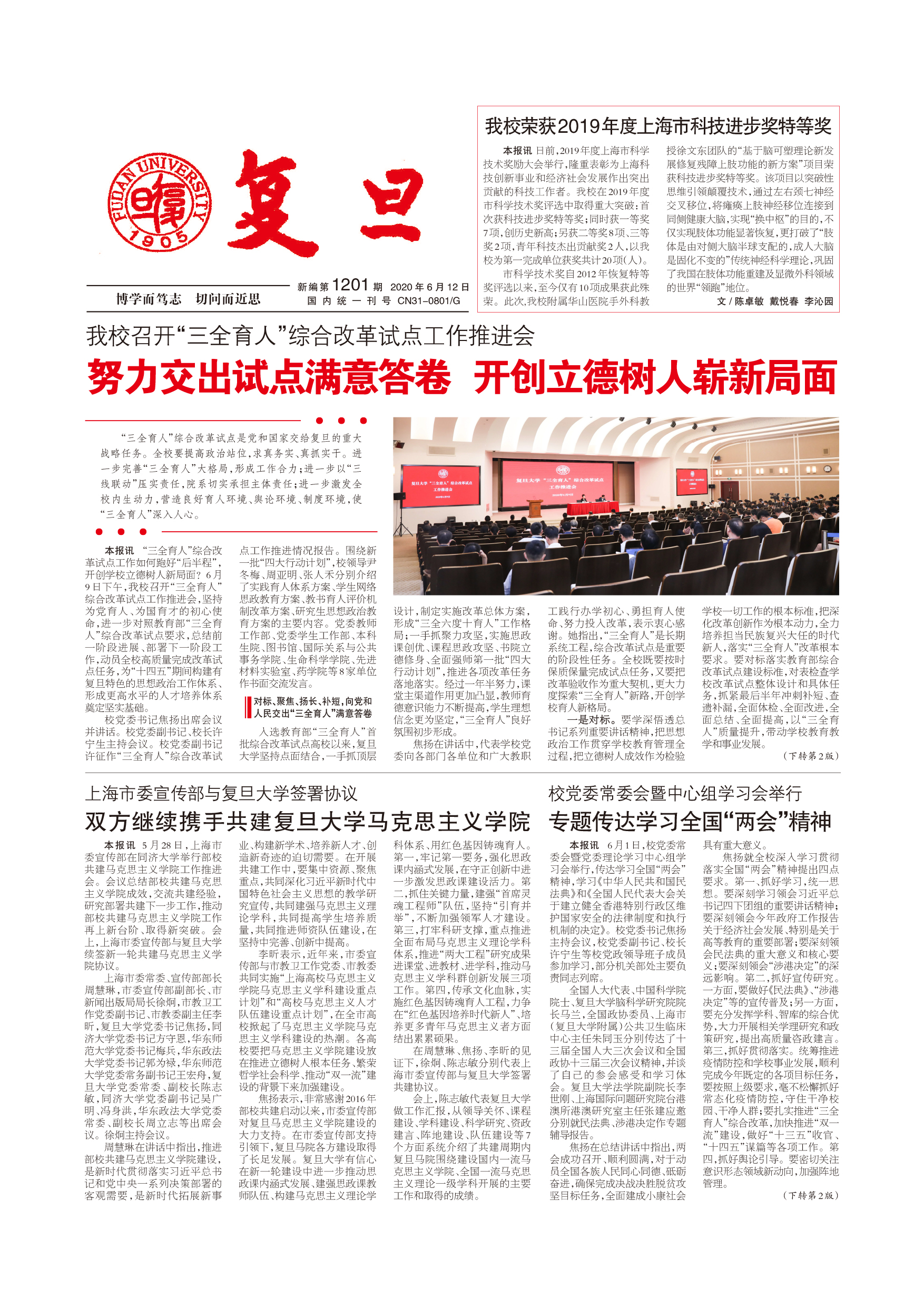 “三全育人”综合改革试点是党和国家交给复旦的重大战略任务。全校要提高政治站位,求真务实、真抓实干。进一步完善“三全育人”大格局,形成工作合力;进一步以...