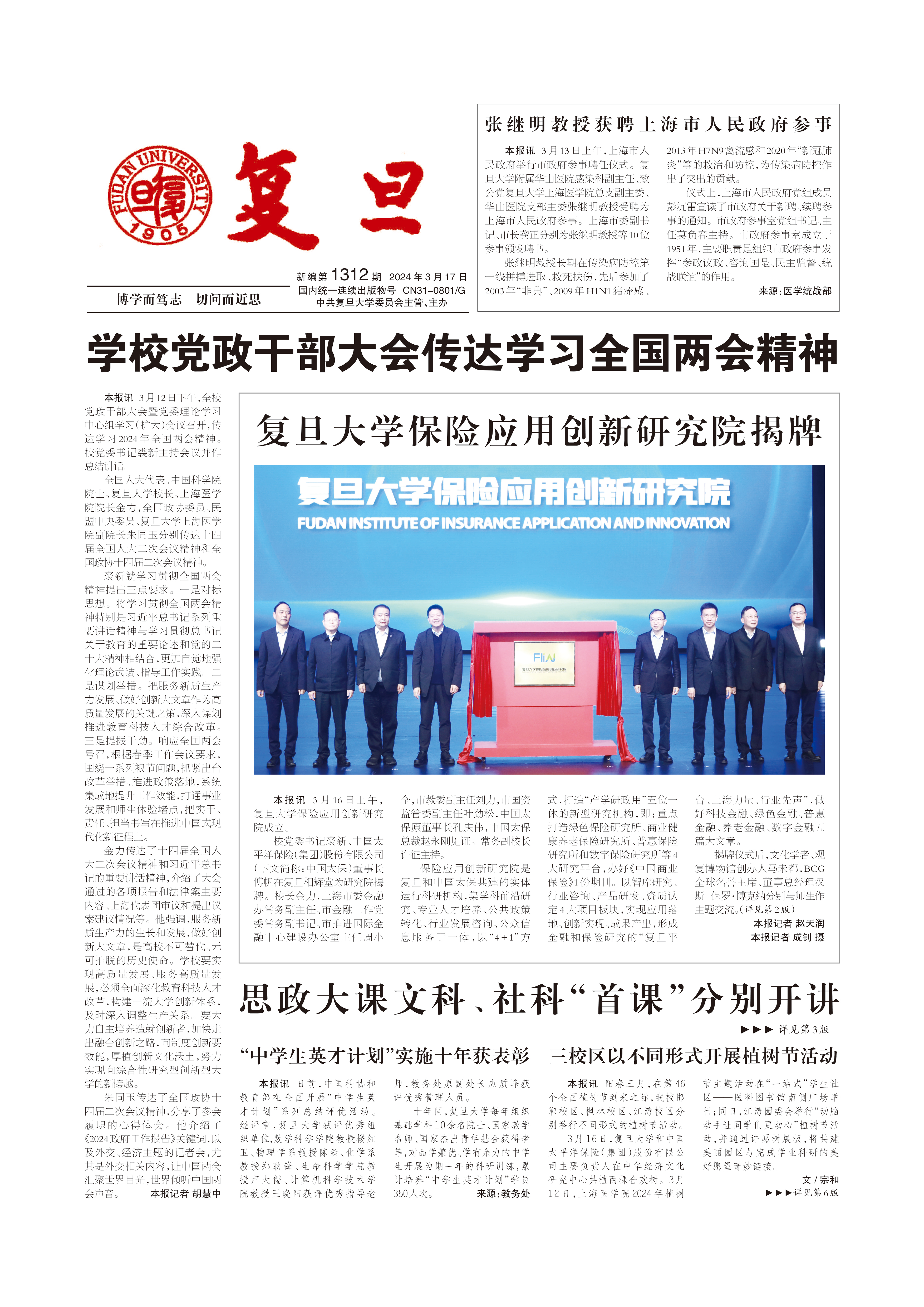 本报讯3月16日上午,2026年足球世界杯直播保险应用创新研究院成立。校党委书记裘新、中国太平洋保险(集团)股份有限公司(下文简称:中国太保)董事长傅帆在复旦相辉堂为研...