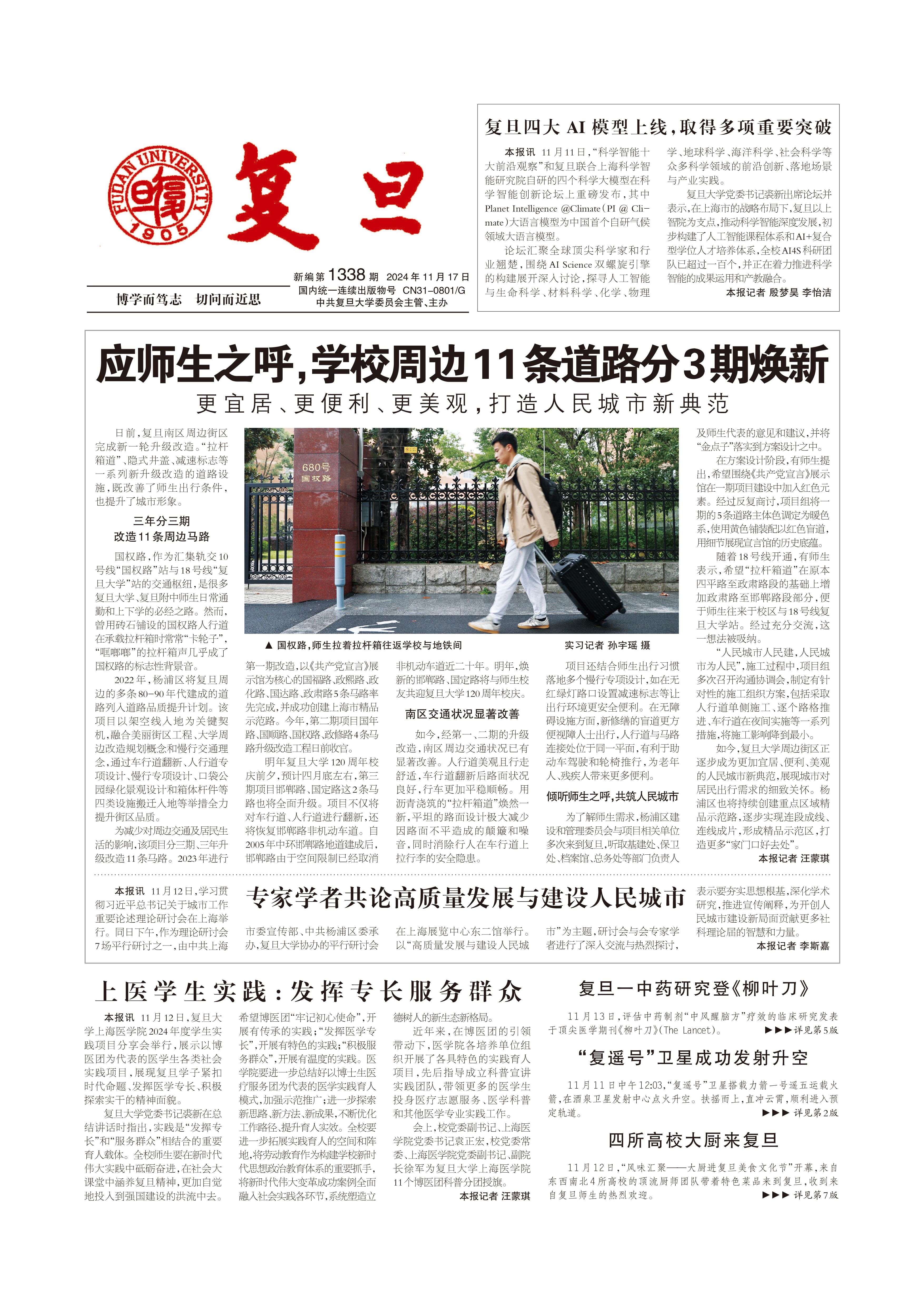 日前,复旦南区周边街区完成新一轮升级改造。“拉杆箱道”、隐式井盖、减速标志等一系列新升级改造的道路设施,既改善了师生出行条件,也提升了城市形象。三年分...