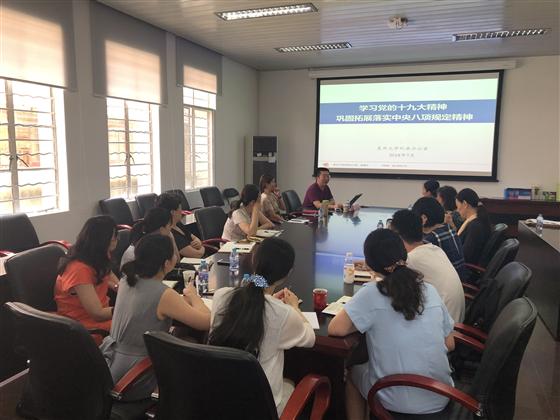 宋老师讲座的主题为《学习党的十九大精神 巩固拓展落实中央八项规定精神》,他通过对八项规定精神的深入解读以及实际案例,为大家开展讲座。宋老师首先讲解了八项规定发展脉络,分别介绍了公务接待、会议和培训、国内差旅、办公用房、因公出国(境)、津贴福利劳务费发放、经费使用和报销的红线禁令以及形式主义、官僚主义的新表现,通过多个案例,为大家敲响警钟。