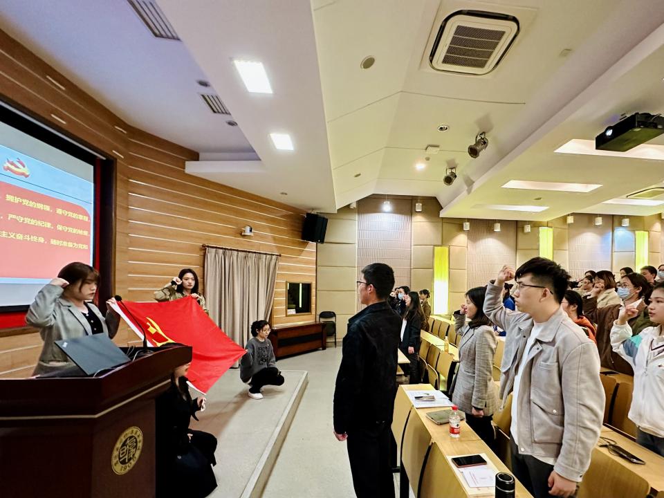 最后,新发展党员入党宣誓仪式,全体预备党员在党员学长的带领下,面向党旗,高举右拳,庄严宣誓,表达了对党忠诚,积极工作,为共产主义事业奋斗终身的决心,并全体奏唱《国际歌》。