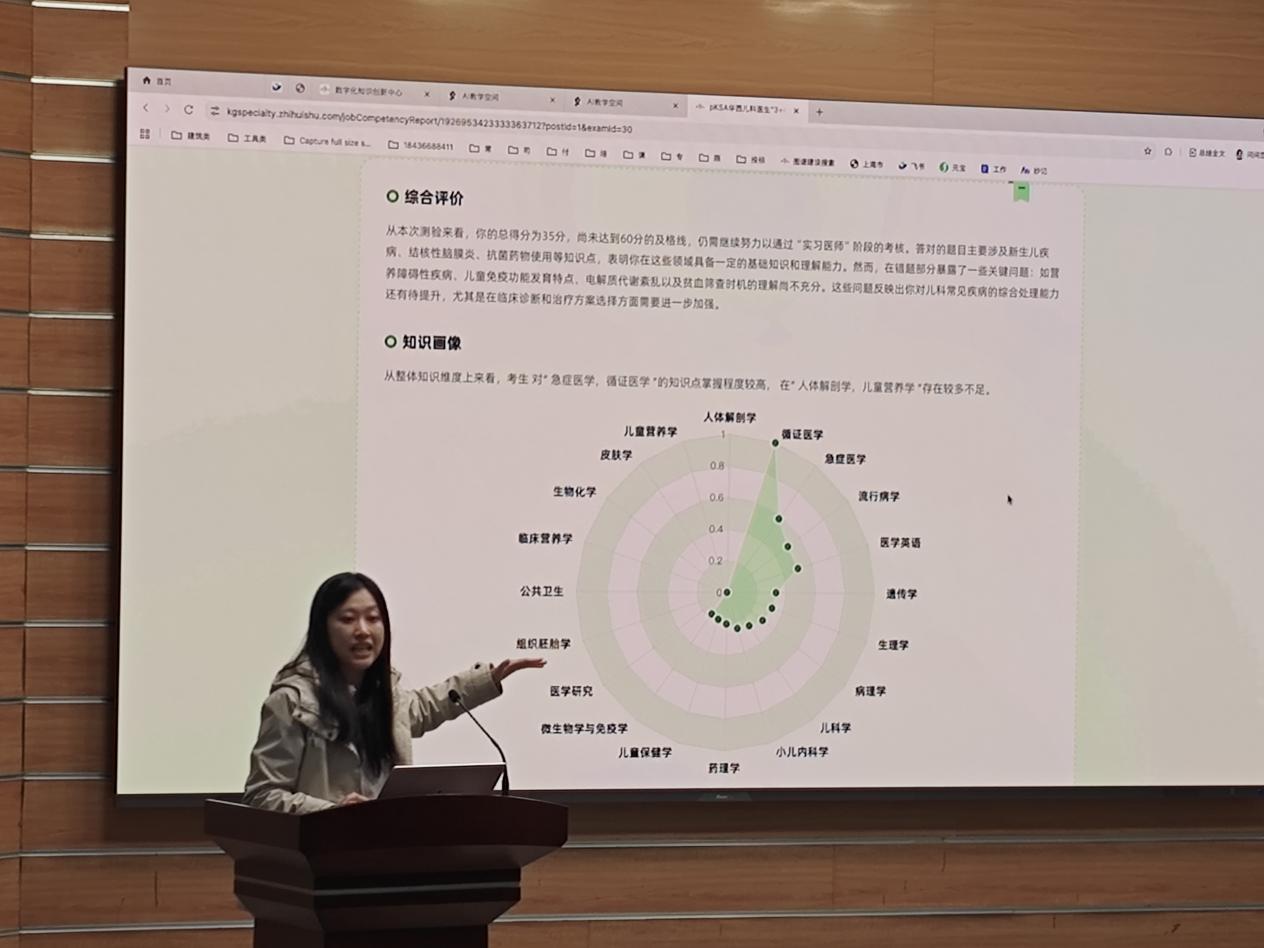 随后,曹金梦老师以协和护理数字化知识创新中心知识图谱建设和华西儿科KSA体系建设为案例,介绍了AI知识图谱构建方案,清晰呈现了知识数字化—结构化—智慧化的三级跃迁过程。她结合知识图谱、技能图谱与素养图谱构成的课程图谱体系,展望了AI赋能教育教学改革的广阔前景。