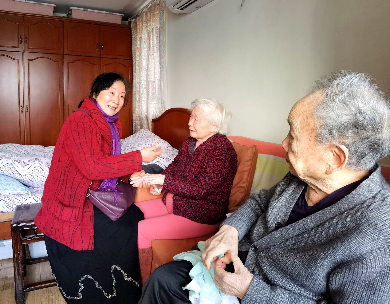 胡雁院长是陈宝琳和陈其芬两位老师的学生。两位老师看到自己昔日的学生都十分激动。在探望陈宝琳老师时,胡院长从手机中翻出以前的一些老照片,95岁的陈老师用放大镜仔细辨认,能叫出很多学生的姓名,回忆往日的趣事,并询问他们的近况。陈其芬老师在胡院长入学时担任原上海医科大学护理学部主任,因股关节骨折一直在家保守治疗。胡院长向老师汇报了学院发展的近况,并详细询问她骨折恢复情况、日常护理及营养。长期卧床皮肤极易产生压疮,胡院长耐心地给陈老师介绍了目前预防压疮的常用物品。一进裘月波老师家,就看到她坐在正对门的沙发上,看到我们就激动地流下了热泪。她老伴告诉我们,裘老师知道学院领导要来探望,早早吃好饭就一直等着。裘老师有时清楚有时糊涂,不停地说学院领导一直关心她,不时地来慰问,非常感谢。应御妹老师不厌其烦地向两位九旬老人介绍常护险的知识。