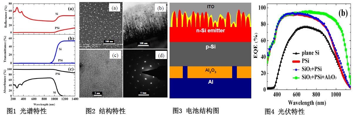 该高效率黑硅太阳能电池的制备工艺简单,成本低廉。作者通过在p型单晶Si(100)(1´1´0.2 mm3)上扩散磷制备pn结,利用化学刻蚀方法在n型发射极中形成多孔黑硅,其紫外-可见光范围反射率低于0.3%(图1)。黑硅由Si纳米晶组成(图2)。在此基础上构筑太阳电池(图3),其中黑硅表面由SiO2钝化,背面由Al2O3钝化,顶电极用ITO,背电极用Al。与平面晶硅电池相比,这种黑硅电池具有宽谱特性(图4),其光电转换效率达到18.97%。硅纳米晶带隙高于晶硅的,因此该黑硅电池的开路电压比平面硅电池的高。另外,由于短波长范围的高吸收度,短波长处的光伏响应也较优。因为采用了背面场效应钝化,抑制了背面区域长波长光激发产生的电子和空穴的复合,由此使长波长处的光伏响应也显著提升。将通过提升开路电压和增强填充因子,进一步提升该种黑硅电池效率。