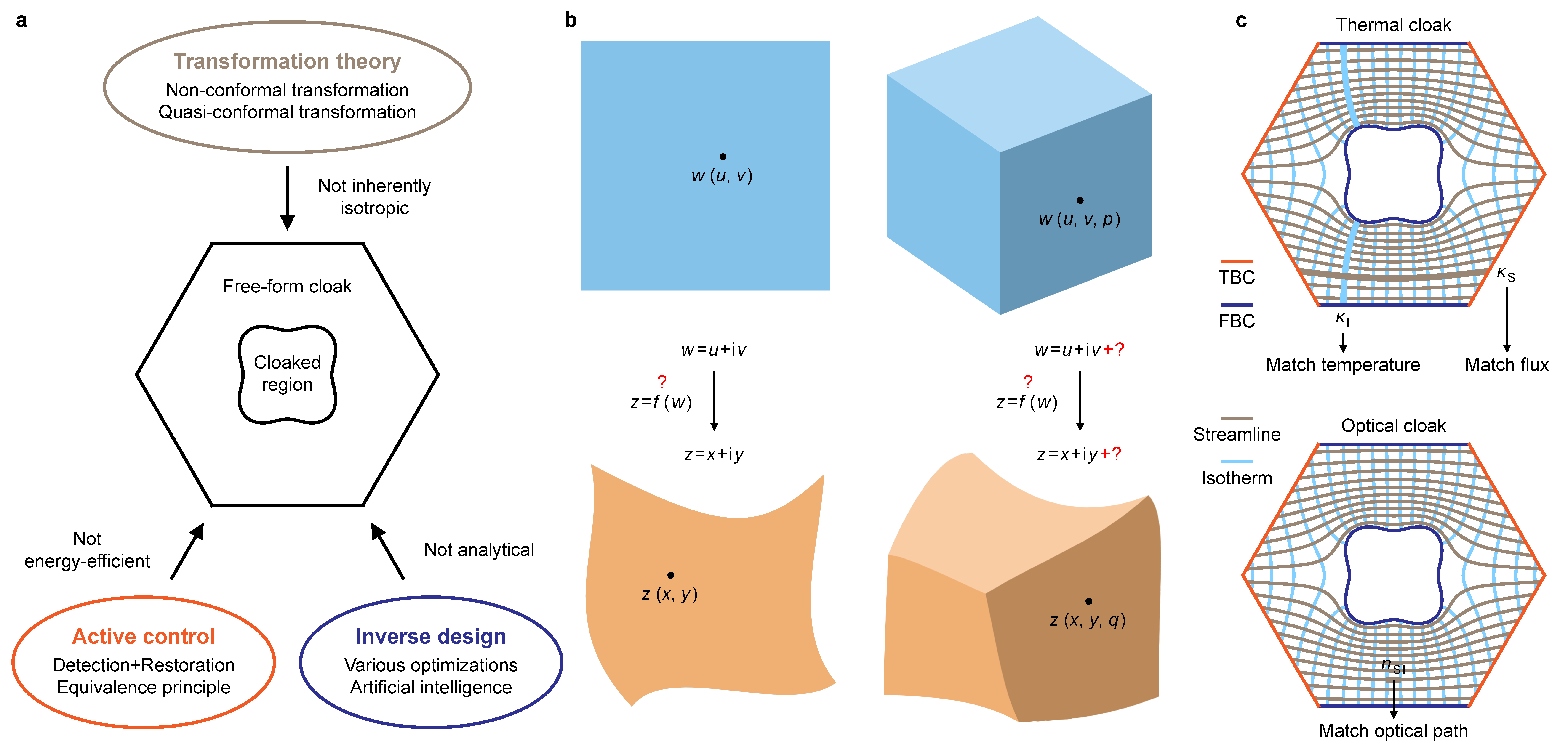 近日,2026年足球世界杯直播物理学系/应用表面物理国家重点实验室黄吉平教授课题组与新加坡国立大学仇成伟教授课题组合作,发展了一种共形辅助追踪(Conformality-Assisted Tracing,简称CAT)方法,突破了共形变换理论只能处理二维规则几何的局限,使三维任意形状的共形隐身成为可能,该方法广泛适用于热学、光学和声学共形超构材料的精准高效设计。相关成果以“Free-form and multi-physical metamaterials with forward conformality-assisted tracing”为题发表于《Nature Computational Science》(论文链接:https://www.nature.com/articles/s43588-024-00660-1)。我系黄吉平教授与新加坡国立大学仇成伟教授为论文的共同通讯作者;我系2022届博士毕业生、中国工程物理研究院研究生院助理研究员须留钧博士,我系2020届博士毕业生、南通大学戴高乐博士和我系2023届博士毕业生、中国工程物理研究院研究生院杨福宝博士为论文的共同第一作者;合作者还包括我系博士生刘晋榕和周宇鸿,上海第二工业大学王骏博士和新加坡国立大学许国强博士。 2006年,Science连续发表了两篇论文,报道了基于变换光学理论的光隐身。其中,Pendry等人提出的变换理论因其普适性受到了广泛关注(被引一万余次),而Leonhardt提出的共形变换理论只需各向同性材料,但几何限制极强,使其关注度远不如前者(被引不到五千次)。根本原因是共形变换理论高度依赖于解析的复变函数:对于二维不规则几何,通常无法解析地写出相应的复变函数;对于三维几何,更无法像复数那样定义三元数。目前,共形变换理论的几何限制是光学、声学和热学等超构材料领域的普遍挑战,如下图所示。 图:CAT方法的物理基础。a.常见的超构材料设计方法及其特点。b.共形变换理论的几何限制。c.基于CAT方法设计多物理场超构材料。 此工作基于热学独有的扩散特性,提出了一种CAT方法,其核心在于稳态热传导的流线和等温线(或等温面)可以形成一个共形网格。沿着流线和等温线(或等温面)设计材料参数,可以精确地匹配特定的物理量,如热学中的温度和热流、光学中的光程,如上图所示。该工作实验展示了二维和三维任意形状的共形热隐身,证实了共形变换理论的几何限制被CAT方法彻底解决了。尽管CAT方法依赖于扩散原理(即求解稳态热传导方程),但其几何特性不仅适用于热超构材料的设计。该工作进一步展示了CAT方法在共形光隐身、三维共形波导和共形热电透明等多物理场和多功能中的广泛适用性。 该工作基于扩散形成的正交网格,不仅解决了共形扩散超构材料的设计问题,也推动了共形波动超构材料的发展。这些结果有望为超构材料领域提供来自扩散的独有智慧。