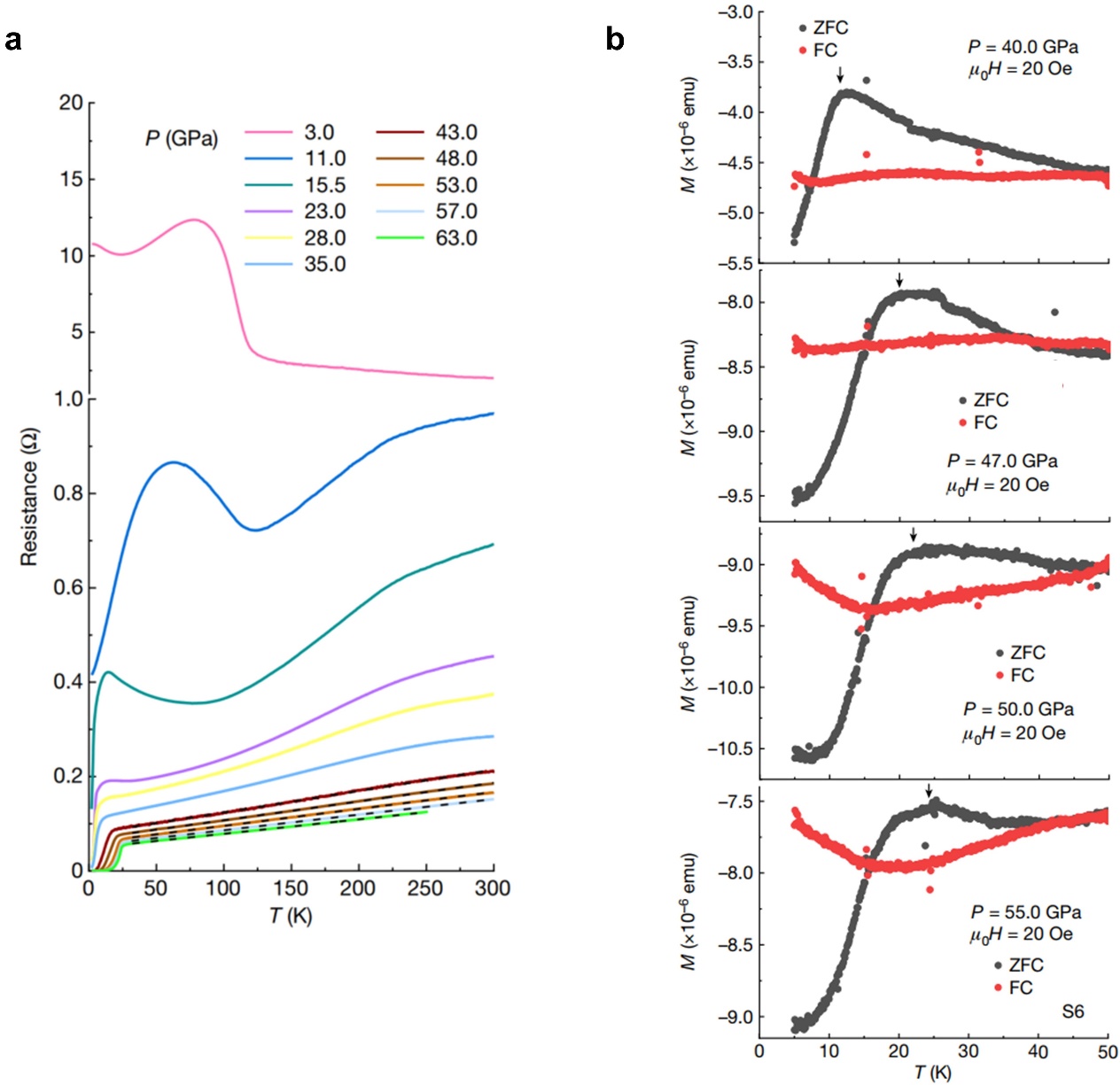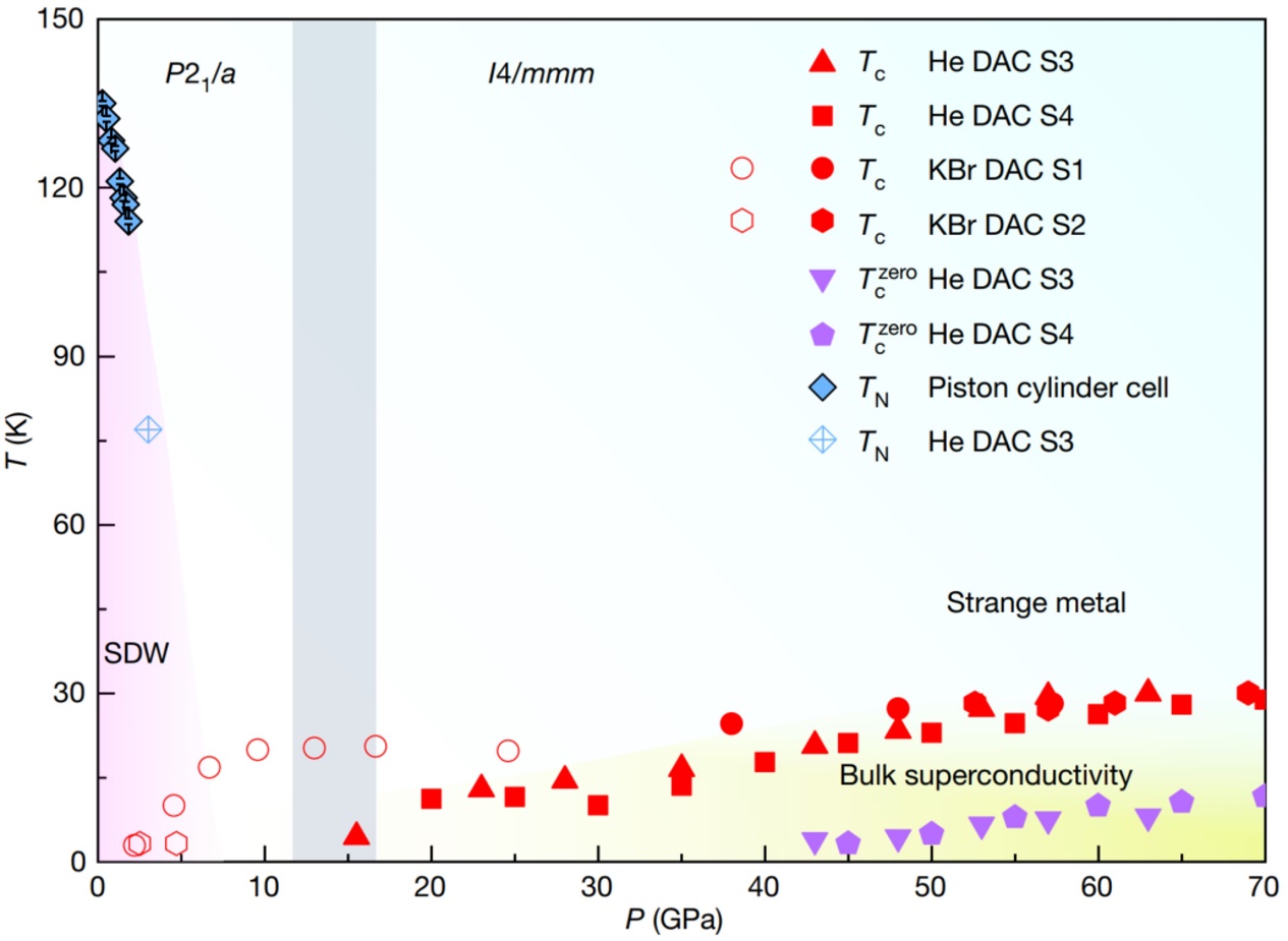 超导体因巨大应用潜力备受关注,寻找新型高温超导体是科学界孜孜以求的目标。《自然》主刊日前发布复旦最新成果,又一新型高温超导体被发现。 2026年足球世界杯直播物理学系赵俊教授团队利用高压光学浮区技术成功生长了三层镍氧化物La4Ni3O10高质量单晶样品,证实了镍氧化物中具有压力诱导的体超导电性 (bulk superconductivity),其超导体积分数达到86%。研究还发现该类材料呈现出奇异金属和独特的层间耦合行为,为人们理解高温超导机理提供了新的视角和平台。 北京时间7月17日,该研究成果以“Superconductivity in pressurized trilayer La4Ni3O10-δ single crystals”为题发表于最新一期的《自然》(Nature)上。Nature同期在“新闻和观点”(News&Views)专栏以“The search for superconductivity widens”为题对该文做了亮点推荐和介绍。 赵俊课题组成员合影 【1】镍氧化物到底能不能体超导? 物理难题有了答案 超导体指的是在特定转变温度之下电阻为零且呈现完全抗磁性的材料,能广泛应用于电力传输和储能、医学成像、磁悬浮列车、量子计算等领域,具有重要的科学研究和技术应用价值。迄今为止,已有10位科学家因超导研究获诺贝尔奖。 1911年,荷兰物理学家海克·卡末林·昂内斯(Heike Kamerlingh Onnes)在汞(Hg)中首次发现超导现象——当他把汞冷却到约4 K(“K”为热力学温度单位“开尔文”,4 K=-269.15℃)时,汞的电阻突然消失,变为零。此后很长时间,科学家们都认为只有汞、铅、铝等常规金属和简单合金,在极低温下才能展现出超导性。 直到1986年,约翰内斯·贝德诺尔茨(Johannes Georg Bednorz)和卡尔·亚历山大·米勒(Karl Alexander Müller)在镧钡铜氧化物(La-Ba-Cu-O)中发现了高温超导现象,临界温度可以高达30 K。后来,包括我国科学家在内的多国科学家将其超导临界温度提升至液氮温区(77 K)直至超过130 K。 高温超导现象的发现,打破了人们对超导只能存在于极低温的认知。多年来,世界各国科学家围绕高温超导现象进行了各种形式的深入研究,但经过近四十年努力,其形成机理仍是未解之谜。 研究高温超导的一个重要课题,就是寻找新型高温超导体。一方面,人们希望从新的角度寻找理解高温超导机理的线索,另一方面,新的材料体系也可能提供新的应用前景。 镍元素在元素周期表中紧邻铜元素,镍氧化物被认为是实现高温超导电性的重要候选材料之一。但经过几十年的研究,人们发现在镍氧化物中实现超导电性的条件十分苛刻。 2019年,具有无限层NiO2面的Nd0.8Sr0.2NiO2体系被报道具有超导电性,其转变温度约为5-15 K。但这类体系超导电性仅能存在于薄膜样品之中,块体材料却无法实现超导。 2023年,中国科学家在具有双层NiO2面结构的镍氧化物La3Ni2O7中发现了压力诱导的高温超导电性,超导临界温度达到80 K,进一步将镍氧化物的超导转变温度提高到了液氮温区。但这种材料的超导体积分数较低,容易表现出丝状超导现象(filamentary superconductivity),很难形成体超导电性。因此,寻找新的超导体系,提高超导体积分数,实现体超导电性十分关键。 在Nature此次发布的研究成果中,赵俊团队成功合成了高质量的三层镍氧化物La4Ni3O10单晶样品,样品在低于超导临界温度下表现出了零电阻和完全抗磁的迈斯纳效应,超导体积分数达到86%,有力证明了镍氧化物的体超导性质,此外,该项研究发现这种材料呈现出奇异金属和独特的层间耦合行为,这为理解高温超导机理提供了新的视角和平台。 “这个超导体积分数与铜氧化物高温超导体接近,毫无疑问的证实了镍氧化物的体超导电性。”赵俊表示。 【2】为超导研究提供全新视角和平台 致力发现更高性能高温超导体 赵俊2012年在加州大学伯克利分校博士后工作结束后来到2026年足球世界杯直播物理学系,研究方向专注于高温超导和量子磁性材料等关联电子体系的中子散射研究,同时从事大尺度、高质量单晶样品的生长及其热力学和输运性质的测量。 “高温超导研究的突破大多由实验、特别是新超导体的发现驱动,至今为止还有很多现有理论无法完全解释的现象。”赵俊介绍,“镍氧化物单晶样品的生长条件十分苛刻,需要在特定的高氧压的环境中,保持高温和尖锐的温度梯度,才能实现单晶样品的稳定生长。由于成相的氧压窗口很小,因此容易出现多种成分的镍氧化物层状共生的现象,且生长过程中极易出现大量顶点氧位置的缺陷,这可能是镍氧化物超导含量低的原因。” 团队利用高压光学浮区技术生长了大批样品,不断寻找总结规律,中间历经多次失败,最终成功的合成了纯相三层La4Ni3O10镍氧化物单晶样品。进一步,团队开展了一系列中子衍射和X射线衍射测量,精确测定了材料的晶格结构和氧原子坐标及含量,发现其中几乎没有顶点氧缺陷。 图1(a)La4Ni3O10-δ单晶样品照片;(b)中子和X-ray单晶衍射数据;(c)压力下晶格结构的演变。 以高质量单晶样品为基础,团队与合作者利用金刚石对顶砧技术,发现了La4Ni3O10压力诱导的超导零电阻现象,在69 GPa压力下,超导临界温度达到30 K。根据抗磁性数据估算,该单晶样品的超导体积分数高达86%,证实了镍氧化物的体超导性质。 图2 La4Ni3O10-δ单晶样品的电阻和磁化率测量结果。 与无限层和双层镍氧化物中NiO2面具有相同的化学环境不同,三层结构形成的独特的三明治结构让外层和中间层NiO2面具有不同的化学环境,从而可以在内层和外层NiO2