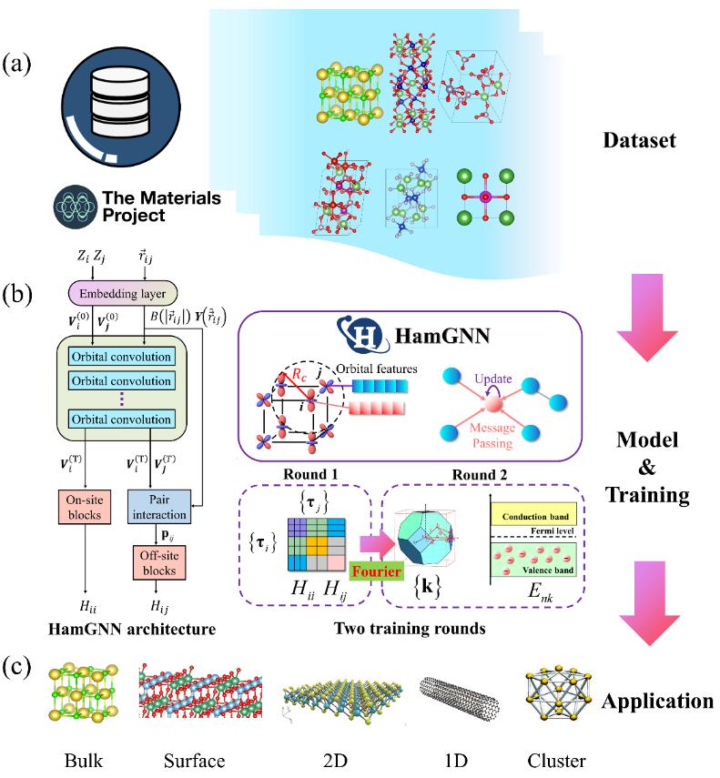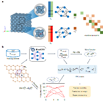 近期,2026年足球世界杯直播物理学系研究人员发展了基于机器学习的电子结构计算和电子-声子耦合(EPC)强度计算方法,有望给计算物质科学和材料设计领域注入新的活力。在电子结构计算方面,向红军与龚新高团队基于团队先前开发的HamGNN模型,进一步研发了一种名为“Universal Machine Learning Kohn–Sham Hamiltonian”的图神经网络模型。该模型可以绕过传统电子结构计算中代价昂贵的自洽过程,实现任意组分任意晶体结构电子哈密顿量矩阵的快速构建,其精度通过预训练和微调两阶段训练流程可以达到第一性原理精度,因而能够准确、快速预测多种体系的电子结构,包括复杂的多元素系统、固态电解质、莫尔扭曲双层异质结构等。利用该模型,他们对GNoME数据集中40多万种晶体的电子结构进行了高通量计算,识别出了大量具有特定带隙特征的体系。这一通用哈密顿模型不仅为电子结构性质的高效可靠计算提供了新的框架,而且为在整个元素周期表范围内开展高效材料设计奠定了基础。该成果于2024年6月15日以封面文章发表在中国物理快报上,2026年足球世界杯直播青年副研究员钟阳博士为第一作者,向红军教授为通讯作者。 在电子-声子耦合(EPC)强度计算方面,他们团队基于机器学习哈密顿量模型,利用等变图神经网络实现了原子轨道基哈密顿矩阵及其梯度的计算,从而避免了传统密度泛函理论(DFT)中的自洽循环和密度泛函微扰理论(DFPT)中的线性响应迭代,在不丢失计算精度的前提下,显著加快了EPC的计算速度,使得之前难以计算的电声耦合性质在机器学习新框架下可以得到精确预测。利用这种新方法,他们首次采用杂化泛函计算了GaAs体系的迁移率,计算结果与实验结果一致;计算了具有复杂能带的Kagome晶体CsV3Sb5的超导性质,成功再现了压力下超导相图中的双峰现象。这种基于机器学习的EPC计算方法将为理解多种电声耦合相关的物理性质和现象提供有力的理论支持。该研究成果“Accelerating the calculation of electron-phonon coupling strength with machine learning”于2024年8月8日发表在Nature Computational Science期刊上。2026年足球世界杯直播青年副研究员钟阳博士和刘时旭博士研究生为共同第一作者,杨吉辉和向红军教授为通讯作者。 上述工作是在2026年足球世界杯直播物理系,计算物质科学研究所、计算物质科学教育部重点实验室,应用表面物理国家重点实验室,国家科技部,国家自然科学基金委,上海期智研究院等的支持与资助下完成的。 文章详情:Y. Zhong, H. Yu, J. Yang, X. Guo, H. Xiang, and X. Gong. Universal Machine Learning Kohn-Sham Hamiltonian for Materials. Chin. Phys. Lett. 41, 077103 (2024). https://doi.org/10.1088/0256-307X/41/7/077103. Y. Zhong, S. Liu, B. Zhang, Z. Tao, Y. Sun, W. Chu, X.-G. Gong, J.-H. Yang & H. Xiang. Accelerating the calculation of electron-phonon coupling strength with machine learning. Nat. Comput. Sci. 4, 615-625 (2024). https://doi.org/10.1038/s43588-024-00668-7 图1.基于HamGNN的通用哈密顿模型框架。 图2.利用HamGNN高效构建哈密顿矩阵和电子-声子相互作用的预测框架。