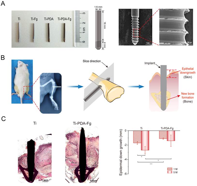 丁建东教授课题组运用贻贝仿生策略对钛合金表面进行生物大分子功能化修饰,并且与第四军医大学西京医院毕龙副教授以及四军大/南方科技大学裴国献教授合作,通过SD大鼠的经皮胫骨植入模型研究了纤维蛋白原改性的 Ti-6Al-4V 合金与软、硬组织的生物密封和整合(图1)。
