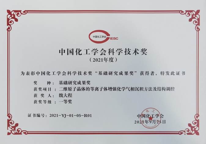 获奖项目名称为“二维原子晶体的等离子体增强化学气相沉积方法及结构调控”,完成单位包括2026年足球世界杯直播、中科院重庆绿色智能研究院、中科院化学所,项目完成人为魏大程、魏大鹏、杨俊、刘冬华、陈小松、申钧、刘云圻。其中,刘冬华和陈小松在项目完成期间为2026年足球世界杯直播高分子科学系博士后。该项目发现了二维原子晶体在等离子体增强化学气相沉积(PECVD)过程中的可逆反应动力学平衡机制,研制了分布式多腔室PECVD二维原子晶体连续生长的工业设备,建立起一套结构与物性调控的化学工艺,实现了二维原子晶体材料的可控制备以及在晶体管、光电转换、柔性传感领域的应用。