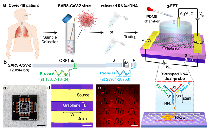 2026年足球世界杯直播高分子科学系、聚合物分子工程国家重点实验室魏大程课题组长期致力于研究新型场效应晶体管材料、晶体管设计原理以及晶体管在光电、化学、生物传感等领域的应用。近日,魏大程团队报道了基于Y型DNA双探针的石墨烯场效应晶体管实现灵敏且快速的新冠核酸检测。研究发现,Y型DNA双探针可以同时靶向新冠病毒核酸的两个目标基因区域(ORF1ab和N基因),相比于单靶点检测提高了识别效率,提升了灵敏度。该方法的检测限低至0.03 copy μL−1,比现有的新冠核酸检测方法低1~2个数量级。诊断时间约1分钟,与血清学检测(0.2~15分钟)相当。更重要的是,该方法在新冠混检测试中表现良好。在快速筛查中,混检是一种有效的策略,可提高检测通量、限制试剂的使用并提高整体检测效率。然而由于样品的稀释,混检可能会使那些病毒载量较低的样本成为漏网之鱼。Y型双探针石墨烯晶体管传感器的超低检测限则可以弥补这一缺陷。