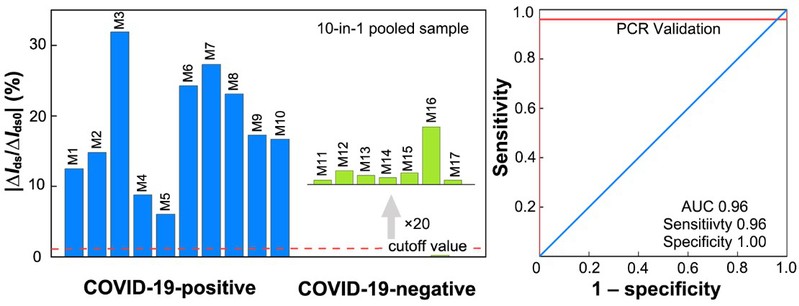 研究发现新冠病毒刺突蛋白(S蛋白)由S1和S2两个亚基组成,其中S1亚基和S蛋白受体识别区是抗原检测中的重要靶点。通过在石墨烯场效应晶体管表面修饰S1蛋白单抗、CR3022单抗、n3021纳米抗体,分别靶向新冠病毒S蛋白不同区域。利用协同作用实现了新冠病毒抗原的快速检测。该传感器的检出限达到3.5 × 10−17 g mL−1量级,能够用于10合1临床混合样本的检测。在43个单人单管临床样本和17个10合1混合样本的检测中,该传感器成功筛查出全部阳性病例,展现出高准确性。