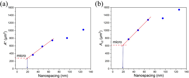 该基础研究的意义不限于针对图案化表面的细胞行为。人们早就认为,在非图案化自由表面上RGD配体的最小有效纳米间距并不是0,但是尚无任何研究可以确认这个数值,因为直接在非图案化表面或者单纯的微米/纳米图案化表面难以开展相关研究。2026年足球世界杯直播丁建东课题组借助其独到的微纳米杂合图案以及对临界细胞黏附面积的考察,通过对一系列RGD纳米间距计算出的细胞临界黏附面积进行渐进分析,首次获得了这个数值。第一临界黏附面积A*(细胞在黏附岛上从无到有)和第二临界黏附面积AC2(随黏附岛面积的增大细胞在黏附岛上从一个变为两个)的计算可以得到几乎一致的配体最小有效纳米间距,约为19 nm(图5)。