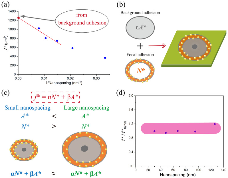 图5 细胞临界黏附面积与一系列微纳米图案的关系以及无图案自由表面上RGD最小有效纳米间距的渐近分析。