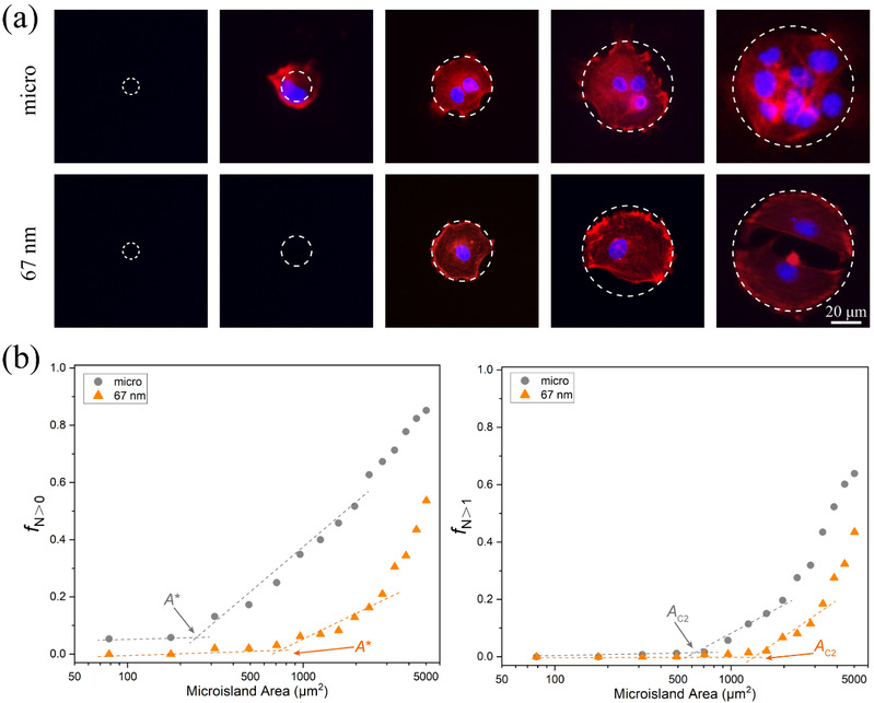 图4 (a)细胞的数量与微米和微纳米岛尺寸之间的关系;(b)随着微米岛尺寸的增加,通过实验结果来确定微纳米图案上细胞临界粘附面积的实验方法。