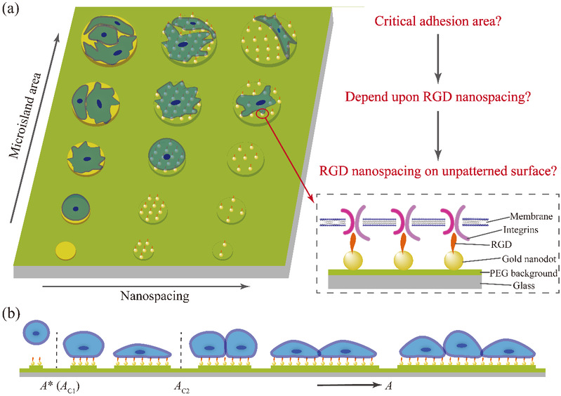 图1 本文探究的基本科学问题和关键术语的示意图:(a)通过一系列微米岛尺寸和配体纳米间距可调的微纳米及微米图案来控制细胞的黏附;(b)细胞在具有抗特异性黏附背景的微纳米图案表面的临界黏附面积示意图。