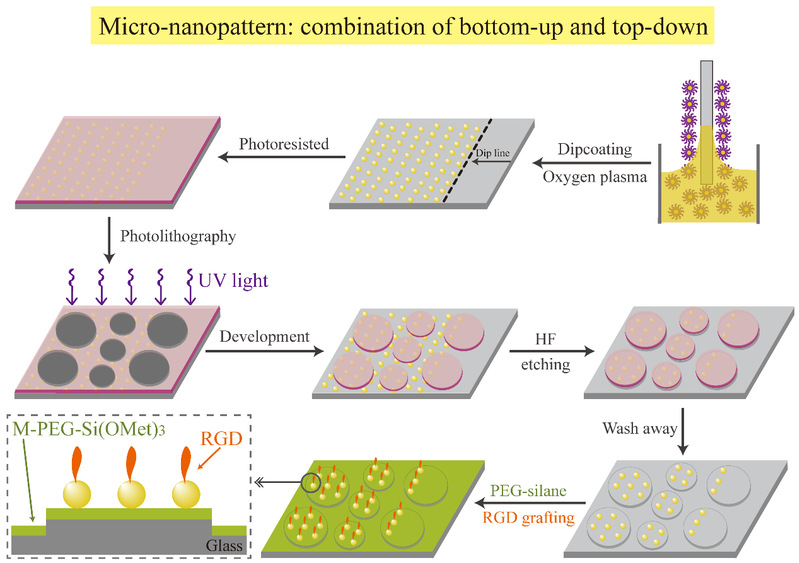 不同于单独的微米图案或纳米图案,丁建东课题组制备的微纳米图案可以同时调控微米岛的尺寸和纳米点之间的间距。首先运用嵌段共聚物胶束自组装纳米刻蚀技术获得纳米金点的阵列,之后结合微米光刻技术和氢氟酸(HF)刻蚀技术,得到玻片表面的金微纳米图案,然后通过硅烷化处理得到抗特异性黏附的背景,最后键接精氨酸-甘氨酸-天冬氨酸(RGD)多肽,制备出一系列具有细胞黏附反差的RGD微纳米图案(图2、图3)。