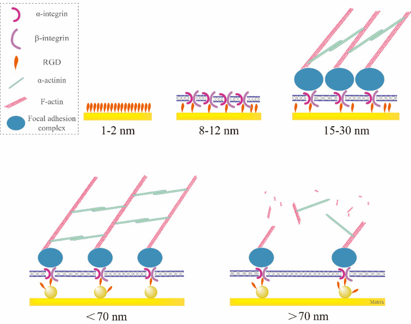 图8 不同尺度的RGD纳米间距调控细胞黏附的原理示意图。上行:即使在纯金表面密集接枝RGD多肽,由于RGD多肽自身尺寸的空间位阻会使得最近的2个RGD之间有1 - 2 nm的间距。Integrin与RGD一对一结合之后,由于整合素蛋白质的尺寸导致最近的2个有效结合的RGD之间有8 - 12 nm的间距。Integrin在细胞膜内侧连接的黏着斑复合物(focal adhesion complex)又有着一定的尺寸,最终导致有效的最近的2个RGD之间的间距约为15 - 30 nm,该文的推导结果(19 nm)恰好在这个范围内。下行:当RGD纳米间距小于70 nm时,细胞可以形成完整而有力的细胞骨架结够,在宏观上体现为细胞的黏附情况良好。当RGD纳米间距大于70 nm时,由于肌动蛋白的长度所限,细胞内部无法形成稳定的细胞骨架结构,从而体现为细胞黏附情况显著变差。