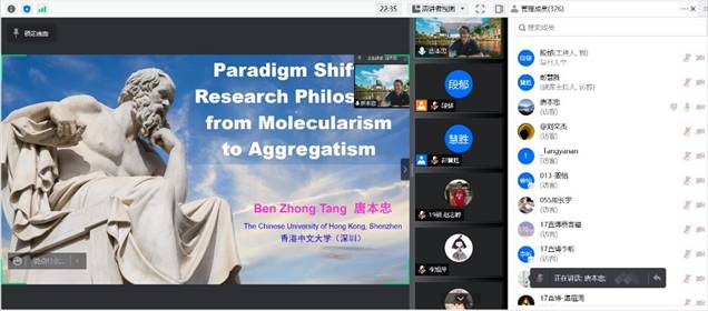 为加强校际学术交流,拓宽同学们的科研视野,高分子科学系于2022年4月12日线上举办了第六场聚合讲坛特邀学术报告。本次报告邀请了中国科学院院士、香港中文大学(深圳)理工学院院长唐本忠教授,作主题为《从分子论向聚集体论的研究范式转移》的报告,报告由系主任彭慧胜教授主持。