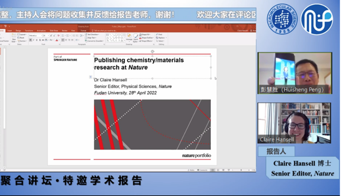 428日,高分子科学系特邀了《自然》期刊资深编辑 Claire Hansell 博士参加聚合讲坛第八辑,作主题为“Publishing Chemistry/Materials Research at Nature”的精彩报告。本次报告由系主任彭慧胜教授主持。