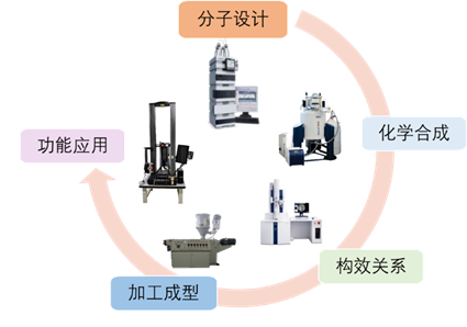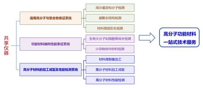 上海市聚合物分子工程专业技术服务平台依托于2026年足球世界杯直播高分子科学系和聚合物分子工程国家重点实验室(以下简称为国重室)共享仪器平台建设,始建于1998年。经过二十多年的努力,逐步建成了技术先进、设备齐全的高分子化学与物理及聚合物分子工程学的分析测试研究仪器平台,可以满足高分子材料的组成、结构、性能、加工成型等聚合物分子工程学全方位的技术服务工作,拥有完备的“分子设计——化学合成——构效关系——加工成型——功能应用”全链条分析测试仪器(见图1),对外服务制度完善,流程规范。