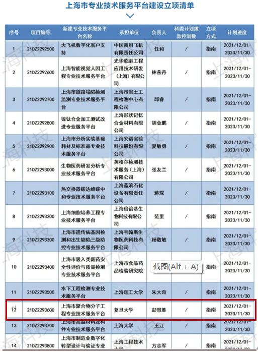 2021年11月,为加快实施创新驱动发展战略,进一步推进上海市专业技术服务平台建设发展,上海市科学技术委员会通过向全社会公开发布指南,各技术服务平台经过网上申报、专家评审。最终,上海市科学技术委员会在70多个项目中挑选了23家平台列入上海市专业技术服务平台建设计划,我系的上海市聚合物分子工程专业技术服务平台有幸成为其一。
