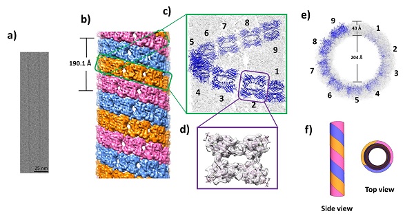 陈国颂-江明课题组利用该课题组前期发展的基于蛋白质和糖相互作用的蛋白质自组装新路线,以具有平面结构的天然蛋白质SBA为基本构筑基元,通过引入小分子配体,成功诱导了SBA自组装,形成了微米管。所得微管的管壁由单层蛋白质构成,其长度在微米级,而管的直径为26纳米,这和天然蛋白质微管的直径非常接近。他们和合作者使用高分辨冷冻透射电镜结合单粒子重构技术,对管壁蛋白质的排列进行解析,并利用计算机模拟给出了小分子在蛋白质之间的连接方式,最终获得了该纳米管的精细结构。结果表明,蛋白质SBA首先通过小分子所参与的糖-蛋白相互作用和小分子配体的π-π相互作用的介导,形成单链,该单链缠绕形成具有三螺旋结构的蛋白质微米管。每个螺旋的重复单元为9个蛋白质,螺距为19 纳米(如图)。同时,该微米管的形成和解离具有良好的动态特性。