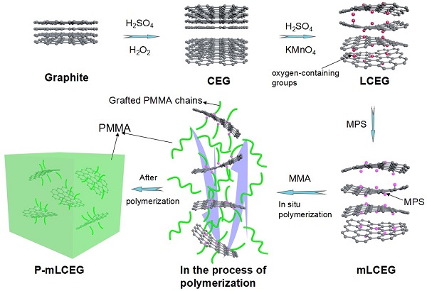 在这里我们首次提出了利用具有超高比表面积的化学膨胀石墨(CEG)进行层间聚合的思路来解决上述难题。通过单体甲基丙烯酸甲酯(MMA)在CEG层间聚合使得CEG自发地剥离成单层和少层的石墨烯最终良好地分散在聚甲基丙烯酸甲酯(PMMA)中。结果表明,CEG较弱的层间相互作用和单体对CEG的润湿是保证MMA层间聚合与后续石墨烯的自发剥离、分散以及最终复合物性能优化的一个关键前提。轻度氧化的CEG(LCEG)在一定程度上可以改善单体对其的亲和性,但是不足以保证LCEG的完全剥离。进一步对LCEG表面修饰后,MMA层间聚合充分进行。最终复合物体现了优异的热力学以及导电性能。弹性模量相较于纯PMMA增加了3倍,同时电导率也超过了1700 S/m。我们预期此种新型的层间聚合反应方法能够加速各种石墨烯基聚合物复合物的工业化应用进程。该论文发表于Chemistry of Materials,第一作者为2014级直博生王鹏,通讯作者为卢红斌教授。详情请见:Peng Wang, Jiajia Zhang, Lei Dong, Chang Sun, Xiaoli Zhao, Yingbo Ruan, and Hongbin Lu, Interlayer Polymerization in Chemically Expanded Graphite for Preparation of Highly Conductive, Mechanically Strong Polymer Composites, Chem. Mater., 2017, 29, 3412-3422.
